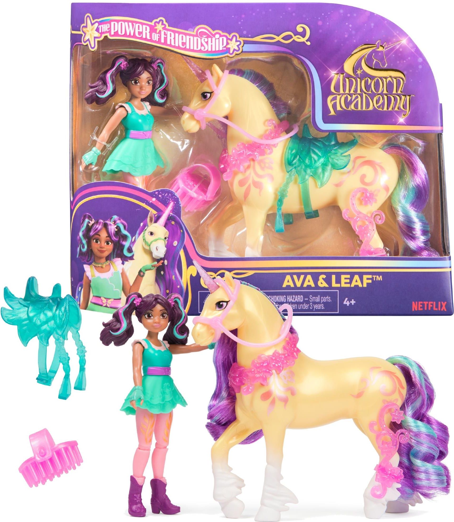 Welcome to the magical world of Unicorn Academy, where friendship and adventure reign supreme! Dive into the enchanting tales of the Unicorn Academy Doll & Unicorn V2 - Ava & Leaf set, inspired by the beloved Netflix animated series and best-selling book series. This delightful playset is perfect for sparking endless imaginative storytelling and is sure to captivate young minds. Ava, the charming rider, stands at 11 cm tall and is crafted with meticulous attention to detail, mirroring her on-screen persona. She features realistic, true-to-show details, including metallic power markings that highlight her magical abilities. With 7 points of articulation, Ava can be posed dynamically, ready to embark on thrilling adventures alongside her unicorn companion. Meet Leaf, the majestic unicorn who stands proudly at 13 cm. Leaf complements Ava’s look with exquisite details, including stunning metallic Plant Magic markings. Her beauty is further enhanced with two translucent clip-on power accessories that adorn her neck and leg, adding an extra touch of magic to playtime. Children can keep Leaf’s mane shiny and smooth with the included brush, ensuring she’s always ready for the next adventure. The set also includes a translucent removable bridle and saddle, allowing Ava to securely stay in place as she rides Leaf into the heart of the Unicorn Academy world. For those who love to expand their magical universe, there are more characters to discover! Look for other dolls like Sophia, Layla, Isabel, and Valentina, along with their unicorns (each set sold separately) to create a complete Unicorn Academy collection. This set is an ideal gift for children who adore unicorns, horse toys, dolls and accessories, dollhouse play, collectibles, plush toys, and more. Whether it’s a birthday, holiday, or just because, the Unicorn Academy Doll & Unicorn V2 - Ava & Leaf set makes for a delightful present that promises hours of enchanting play. Embark on a journey filled with magic, friendship, and adventure with the Ava & Leaf set from Unicorn Academy, and let your child’s imagination soar!