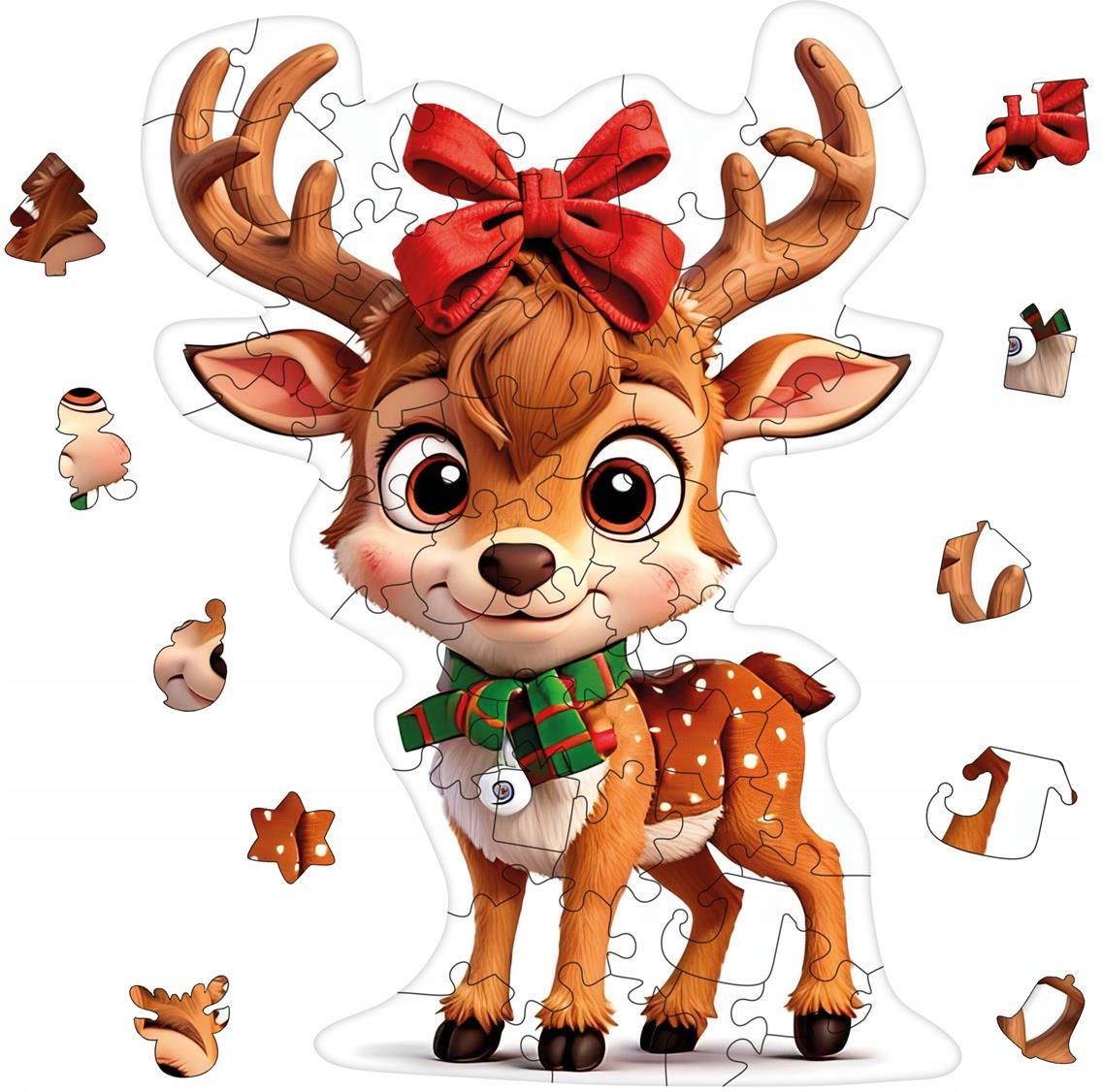 Puzzle drewniane - Christmas - Caramel Reindeer - 50 el. Uroczy reniferek z kokardką między rogami i dzwoneczkiem na szyi to idealna propozycja dla najmłodszych miłośników świątecznych przygód. Puzzle drewniane, o nieregularnych kształtach, wprowadzają element zaskoczenia, a wyjątkowe kawałki o …