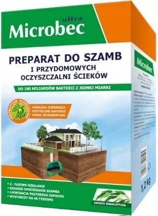 Preparat do szamb i przydomowych oczyszczalni ścieków Microbec Ultra eukaliptus 1,2 kg Preparat do szamb i przydomowych oczyszczalni ścieków Microbec Ultra eukaliptus 1,2 kg Mikrobiologiczny preparat enzymatyczny najnowszej generacji przeznaczony do biodegradacji zawartości szamba. Środek o bardzo świeżym i intensywnym zapachu eukaliptusa, który wyjątkowo skutecznie usuwa charakterystyczną dla szamba przykrą woń. Systematyczne stosowanie Microbec’u zmniejsza częstotliwość opróżniania szamba, wspomaga pracę przydomowych oczyszczalni ścieków i udrażnia system instalacji sanitarnej. Microbec wykorzystuje innowacyjne, opatentowane rozwiązanie polegające na zamknięciu aktywnych bakterii w mikrosferach otoczonych specjalną ochronną powłoką. Dzięki temu zawarte w nich mikroorganizmy nie giną w kontakcie z silnymi środkami chemicznymi, a produkt zachowuje skuteczność przy jednoczesnym stosowaniu tradycyjnych detergentów. Microbec Ultra o zapachu eukaliptusa to nowoczesne rozwiązanie dla każdego rodzaju szamba oraz ekologicznych przydomowych oczyszczalni ścieków, bardzo duża zawartość pożytecznych bakterii chronionych przed szkodliwym działaniem detergentów musująca formuła rzadsze opróżnianie szamba usuwanie osadów, złogów i zatorów, likwidacja przykrego zapachu. Działanie preparatu Microbec zawiera wyspecjalizowane kultury bakterii oraz enzymy, które przyspieszają naturalny proces rozkładu resztek organicznych, m.in. nieczystości, tłuszczy, resztek roślinnych, papieru. Obecne w preparacie bakterie ulegają bardzo szybkiemu namnażaniu i już po godzinie od zastosowania ich liczebność w szambie osiąga poziom nawet kilkuset miliardów sztuk. Produkt działa 3-fazowo: zapewnia szybki i skuteczny rozdział zanieczyszczeń, które podlegają upłynnieniu, a następnie enzymatycznemu rozkładowi do całkowicie bezpiecznych i przyjaznych środowisku związków prostych i wody. Pozwala to na oczyszczenie szamba z nagromadzonych osadów i zatorów, zmniejsza częstotliwość opróżniania zbiornika i zapewnia wysoką sprawność działania oczyszczalni. Preparat nie powoduje korozji urządzeń sanitarnych, jest bezpieczny dla ludzi, zwierząt i środowiska. Sposób użycia Miarkę (25 g) wsypać do toalety i dokładnie spłukać wodą. Dawka początkowa: 2 miarki/ 2 saszetki na 3 m³ Dozowanie podtrzymujące według schematu: 1 miarka/ saszetka tygodniowo (25g) na każde 2-3 m³ pojemności szamba. W celu osiągnięcia maksymalnej skuteczności preparatu należy stosować go systematycznie, najlepiej w połączeniu z bezchlorowymi preparatami do czyszczenia toalet, np. Microbec WC BIO Żel.