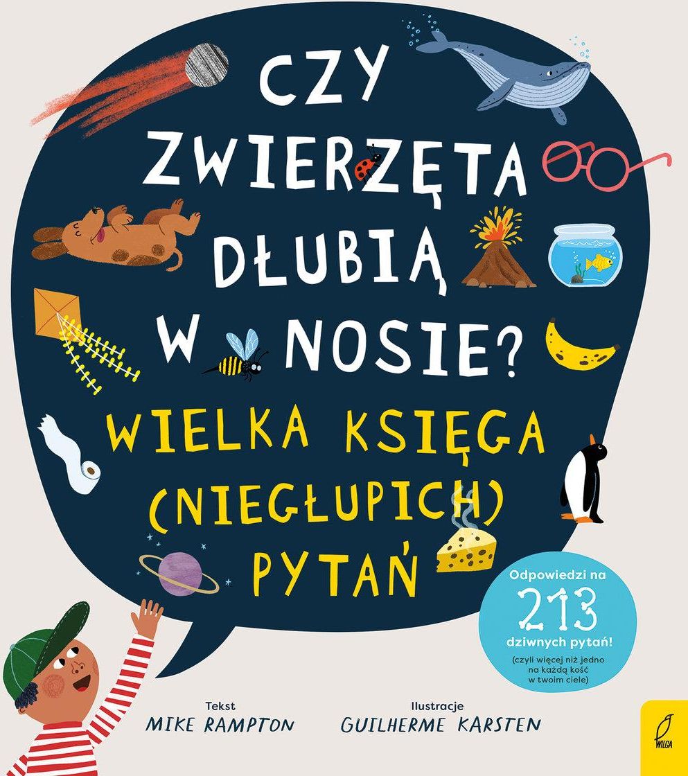 Dzieci zadają mnóstwo pytań – nie tylko tych najbardziej oczywistych, ale też takich, o których dorośli mogliby nawet nie pomyśleć. Jest to więc książka, która pomoże się dowiedzieć, czy: dinozaury kichały? Co się stanie, jeśli ktoś wpadnie do wulkanu? Ile kości ma człowiek? Jak astronauci załatwiają się w kosmosie? Kto wynalazł czekoladę? Do czego służą brwi? Jaka jest największa liczba? Jak pingwiny rozróżniają inne pingwiny? Książka idealna dla wszystkich młodych czytelników poszukujących odpowiedzi na wszystkie pytania świata, ale też dla rodziców, którzy chcą zaspokoić ciekawość najbardziej dociekliwego dziecka. Czy zwierzęta dłubią w nosie? Księga (niegłupich) pytań Odkryj fascynujący świat pytań i odpowiedzi w książce, która zaspokoi ciekawość najmłodszych! "Czy zwierzęta dłubią w nosie?" to publikacja, która w przystępny sposób odpowiada na najbardziej nietypowe pytania dzieci, zachęcając je do odkrywania otaczającego świata. Dla kogo jest ta książka? Dzieci w wieku przedszkolnym i wczesnoszkolnym, które są ciekawe świata Rodzice, którzy chcą wspierać rozwój ciekawości swoich dzieci Nauczyciele i opiekunowie, którzy szukają inspiracji do zajęć z dziećmi Co zyskasz dzięki tej publikacji? Odpowiedzi na nietypowe pytania, które nurtują dzieci Możliwość rozwijania wiedzy i wyobraźni najmłodszych Inspirację do dalszych rozmów i eksploracji tematów naukowych Kluczowe tematy i obszary Fascynujące pytania o zwierzęta i ich zachowania Interesujące fakty o dinozaurach i kosmosie Wiedza o ludzkim ciele i jego funkcjonowaniu Historia wynalazków, takich jak czekolada O Autorze Mike Rampton to autor, który z pasją tworzy książki dla dzieci, łącząc edukację z zabawą. Jego publikacje są cenione za przystępność i umiejętność angażowania młodych czytelników. O Wydawcy Wilga to renomowane wydawnictwo specjalizujące się w literaturze dziecięcej. Dzięki wieloletniemu doświadczeniu, oferuje książki, które rozweselają, uczą i inspirują młodych czytelników. Producent/osoba odpowiedzialna za bezpieczeństwo produktuGRUPA WYDAWNICZA FOKSAL SPÓŁKA Z OGRANICZONĄ ODPOWIEDZIALNOŚCIĄul. Marszałkowska 116/12200-017 Warszawaplaton@platon.com.pl223295000