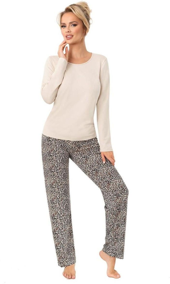 Otul się komfortem i kobiecym stylem dzięki tej eleganckiej piżamie damskiej z miękkiej wiskozy. Gładka, kremowa bluzka z długim rękawem i klasycznym, okrągłym dekoltem zapewnia wygodę i swobodę ruchów, a spodnie w modny zwierzęcy wzór dodają charakteru i pazura. Idealna na każdą porę roku – lekka, oddychająca i przyjemna dla skóry. Doskonały wybór na prezent lub jako stylowa część Twojej kolekcji domowej odzieży nocnej.