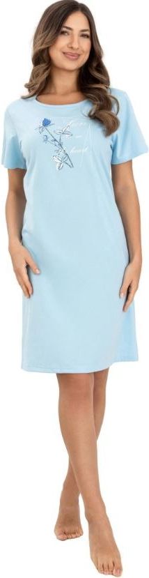 Koszula nocna Regina w klasycznym prostym kroju, wykonana z bawełny. Koszula z krótkim rękawem, dekolt półokrągły, długość przed kolano. Całość w niebieskim kolorze , przód ozdobiony nadrukiem. Skład: 100% bawełna