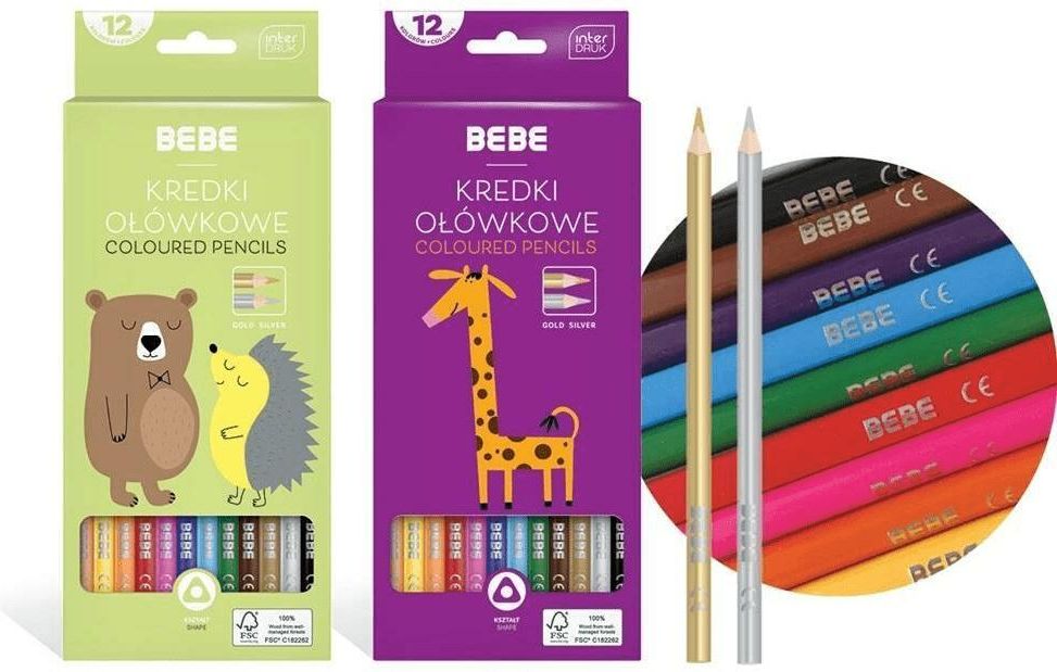 Kredki trójkątne dla dzieci 12 kolorówKredki ołówkowe marki Bebeto zestaw 12 kredek ołówkowych z upragnionymi złotymi i srebrnymi kredkami!Kolorowe kredki charakteryzują się niezwykle nasyconymi kolorami. Niezwykle miękki ołówekzapewnia doskonałe krycie i jest idealny do rysowania, wypełniania dużych obszarów i płynnych przejść między kolorami.Zalety:12 intensywnych kolorówSrebrne i złote kolory!Trójkątny profil kredki!Super miękka i niełamliwaProdukt z deklaracją FSC - dbamy o środowisko!Parametry:Marka: BebeTyp: TrójkątnyTyp: Kredki ołówkoweIlość w zestawie: 12 sztukKolor: WielokoloroweZastosowanie: Kredki ołówkowe dla dzieciCena dotyczy jednego zestawu.Wysyłany losowy wzór dostępny w magazynie. Miks wzorów, towar wysyłany losowo. Cena za sztukę.12 intensywnych kolorów, w tym złoty i srebrny. Trójkątny profil kredki. Supermiękkie i niełamliwe. Produkt dostępny w 2 wersjach kolorystycznych. Produkt z oświadczeniem FSC - dbamy o środowisko!