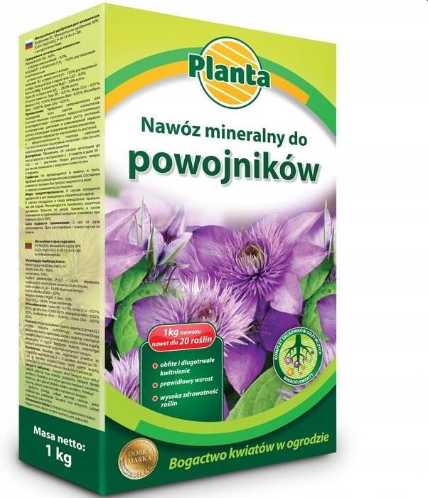 Nawóz Do Powojników Pnączy Clematis Klematisów 1Kg Nawóz Do Powojników Pnączy Clematis Klematisów 1Kg to produkt stworzony z myślą o miłośnikach ogrodnictwa, którzy pragną zadbać o zdrowie i piękno swoich roślin. Dzięki odpowiednio dobranym składnikom, nawóz ten wspiera wzrost oraz intensywne kwitnienie powojników pnących, które zachwycają swoimi efektownymi kwiatami. Wybierając ten nawóz, inwestujesz w zdrowie swoich roślin oraz ich estetykę. Rodzaj nawozu Wybór odpowiedniego nawozu jest kluczowy dla zdrowia i wzrostu roślin, zwłaszcza dla powojników pnących, które mają szczególne wymagania w zakresie składników odżywczych. Nawóz do pnączy w opakowaniu 1 kg to doskonałe rozwiązanie dla wszystkich odmian tych efektownych roślin. Jego uniwersalne zastosowanie sprawia, że nadaje się do nawożenia zarówno młodych, jak i dojrzałych powojników, zapewniając im kompleksową pielęgnację. Dzięki zrównoważonemu składowi, nawóz wspiera intensywne kwitnienie oraz zdrowy rozwój roślin. Oto kluczowe cechy produktu: Pojemność: 1 kg, Przeznaczenie: do kwiatów, Producent: Planta, Typ: nawóz do pnączy, Forma: granulowana. Skład i właściwości dodatkowe Kluczowym atutem nawozu mineralnego do powojników jest jego przemyślany skład, w którym proporcje makroskładników NPK wynoszą 11-16-21. Dzięki takiemu zestawieniu, rośliny otrzymują niezbędne substancje odżywcze, które wpływają na ich wzrost, zdrowotność oraz wydajność kwitnienia. Oprócz podstawowych składników, nawóz może zawierać również mikroelementy, które są istotne dla prawidłowego funkcjonowania roślin. Regularne stosowanie nawozu sprzyja nie tylko obfitemu kwitnieniu, ale również poprawia intensywność i wybarwienie kwiatów, co znacząco podnosi estetykę ogrodu. Forma i zastosowanie Nawóz dostępny jest w formie granulowanej, co ułatwia jego aplikację. Granulki są łatwe do rozprowadzenia w glebie, co umożliwia równomierne dostarczenie składników odżywczych do systemu korzeniowego roślin. Można go stosować od początku wegetacji do końca sierpnia, co 2-3 tygodnie, co czyni go wszechstronnym rozwiązaniem dla każdego ogrodnika. Warto podkreślić, że nawożenie powinno odbywać się na wilgotnej glebie, co sprzyja lepszemu wchłanianiu substancji odżywczych przez rośliny. Dawkowanie i instrukcja użycia Dawkowanie nawozu do pnączy jest proste i elastyczne. Aby uzyskać najlepsze wyniki, warto stosować się do poniższych wskazówek: Rozcieńczenie: Przygotuj roztwór składający się z 10 ml nawozu na 1 litr wody. Częstotliwość: Stosuj nawóz co 2-3 tygodnie, w zależności od potrzeb roślin. Aplikacja: Nawożenie powinno odbywać się na wilgotnej glebie, co sprzyja lepszemu wchłanianiu. Dokładne wymieszanie nawozu z wodą przed użyciem zapewni jednorodny roztwór, co ułatwi jego aplikację. Bezpieczeństwo dla roślin i środowiska Nawóz do powojników pnących nie tylko przyczynia się do ich zdrowotności, ale również jest bezpieczny dla środowiska. Produkt spełnia normy Unii Europejskiej dotyczące nawozów mineralnych, co gwarantuje jego wysoką jakość i skuteczność. Zawiera składniki, które są biodegradowalne i nie szkodzi korzeniom roślin. Dodatkowo, nawozy zgodne z normami UE przechodzą regularne kontrole jakości, co zapewnia ich bezpieczeństwo oraz minimalizację negatywnego wpływu na środowisko naturalne. Opakowanie Produkt dostępny jest w praktycznym opakowaniu o masie netto 1 kg, które zapewnia wygodne przechowywanie i użytkowanie. Kartonowe pudełko jest lekkie i łatwe do transportu, a jednocześnie wystarczająco mocne, by zabezpieczyć zawartość przed uszkodzeniem. Dodatkowo, dzięki odpowiedniej wielkości opakowania, nawóz wystarcza średnio na nawożenie około 20 roślin, co czyni go ekonomicznym rozwiązaniem dla każdego ogrodnika.