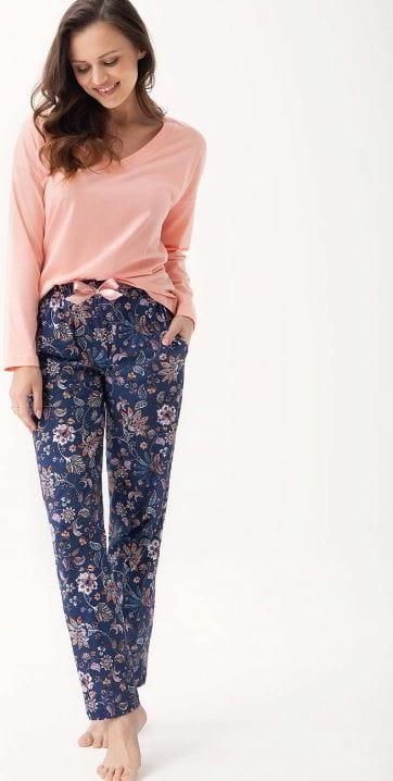 Piżama damska wykonana z miłej w dotyku bawełny. Bluzka z długim rękawem z dekoltem w kształcie litery V. Do kompletu długie, wzorzyste spodni z kieszonkami. W pasie ozdobna kokardka. Skład: 100% bawełna