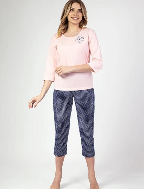 Piżama damska Regina wykonana z bawełny. Koszulka w kolorze różowym z nadrukiem na piersi, rękaw o długości 3/4, dekolt półokrągły. Spodnie proste, wzorowane w kolorze granatowym o długości 7/8. Skład: 100% bawełna