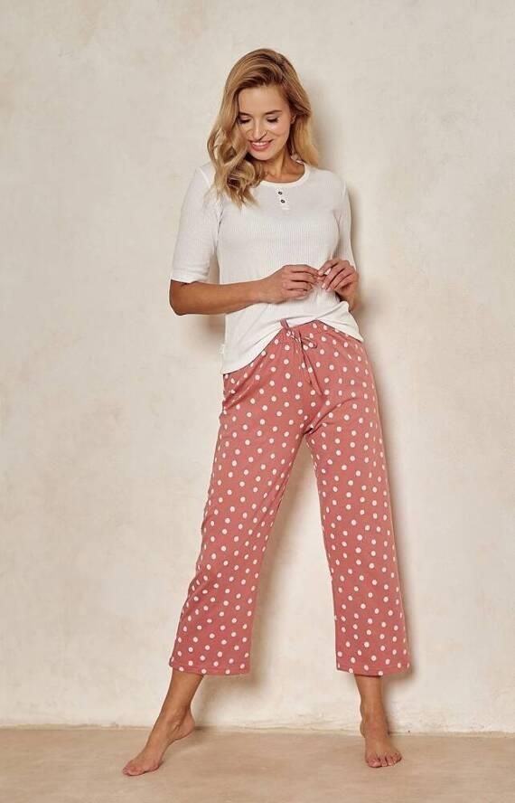 Piżama damska, wykonana z wysokiej jakości bawełny. Koszulka z krótkim rękawem z prążkowanej bawełny w kremowym kolorze, dekolt ozdobiony guzikami . Do kompletu spodnie typu rybaczki w kropki. Skład: 100% bawełna.
