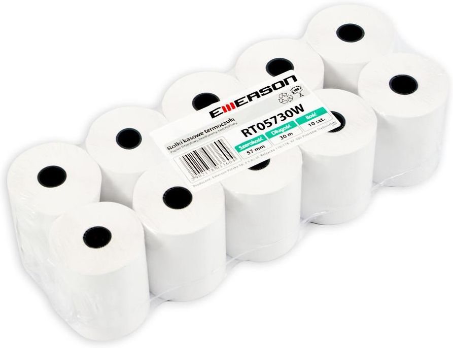 ROLKI TERMICZNE I FAKSOWE -produkowane są z papieru termoczułego o gramaturze 55 g/m?. -Producent papieru udziela gwarancji trwałości wydruku do 6 lat. -Typowe zastosowanie rolek termicznych: * kasy, * bankomaty, * telefaksy. -Proces produkcji obejmuje również projektowanie i nadruk na rolkach dodatkowych informacji bądź reklamy. -Najwyższa jakość rolek Emerson zapewnia komfort pracy i bezpieczeństwo użytkowników. -Rolki pakowane są w folię termokurczliwą, zapewniającą wysoką estetykę i trwałość produktu. długość [m]: 6EAN: 5902178501509Kod Producenta: rt05706wkSzerokość [mm]: 57