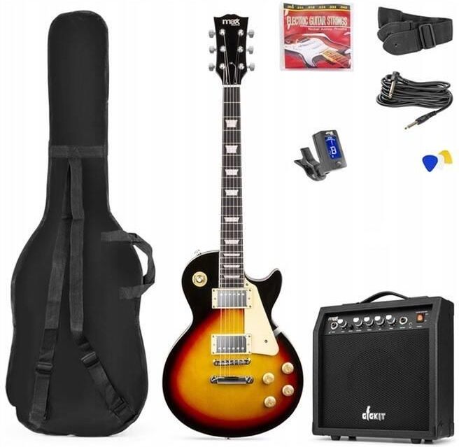 Gitara elektryczna GigKit w stylu LP Sunburst+ wzmacniacz+ akcesoria Zestaw/ Gitara elektryczna GigKit w stylu LP Sunburst ze wzmacniaczem Zestaw gitary elektrycznej GigKit – najlepszy pakiet dla każdego początkującego i nieco bardziej zaawansowanego gitarzysty! Zawiera wszystko, czego potrzebujesz, aby od razu zacząć grać na gitarze elektrycznej. Gwiazdą oczywiście jest nasza najwyższej jakości gitara elektryczna o klasycznym wyglądzie i pięknym wykończeniu. Dzięki pełnowymiarowemu korpusowi, wygodnemu gryfowi i wszechstronnym przetwornikom, ta gitara jest idealna dla graczy na wszystkich poziomach. Aby mieć pewność, że uzyskasz możliwie najlepszy dźwięk, dołączyliśmy także wysokiej jakości wzmacniacz. Dzięki regulowanej kontroli barwy i dużej mocy, ten wzmacniacz sprawi, że będziesz brzmiał świetnie, niezależnie od tego, czy ćwiczysz w sypialni, czy występujesz na scenie. Zestaw z gitarą elektryczną GigKit zawiera wszystko, czego potrzebujesz, aby rozpocząć swoją muzyczną podróż. Piękne kształty w stylu LP Wielu znanych gitarzystów, od Slasha po Joe Bonamossa, ma bzika na punkcie gitary w stylu LP. Integrujący wygląd tego modelu można teraz nazwać ikonicznym. Ale oczywiście ten wygląd nie jest jedyną rzeczą, która sprawia, że ​​ta gitara jest tak popularna. Sunburst w stylu MAX LP oferuje nie tylko niesamowity komfort gry, ale także niesamowicie dobry dźwięk. Przetworniki Humbucker zapewniają pełny i solidny dźwięk Zestaw dobrych przetworników zawsze odgrywa ważną rolę w dobrze brzmiącej gitarze. Sunburst w stylu MAX LP jest wyposażony w dwa przetworniki humbucker. Elementy te są znane z wytwarzania pełnego i solidnego dźwięku, ale ograniczają hałas do minimum. Te przetworniki są szczególnie odpowiednie do cięższych rodzajów muzyki, takich jak rock i metal, ale także udowodniły swoją siłę w kilku gatunkach muzycznych. Nie brakuje także gitarzystów bluesowych, którzy bez wahania wybierają przetworniki typu Humbucker. Pickguard w kolorze kości słoniowej dodaje instrumentowi stylowego wykończenia, podkreślając jednocześnie jego elegancję. Błyszczące wykończenie i chromowane elementy nadają gitarze nie tylko nowoczesny wygląd, ale także chronią ją przed codziennym zużyciem. Gitarę cechuje rzeźbiony korpus z lipy, który nie tylko prezentuje się elegancko, ale również zapewnia doskonałą wytrzymałość Twardy marmurowy gryf z 22 progami i mechanizmy tuningowe w stylu vintage gwarantują precyzyjne i stabilne strojenie. Mostek Tune-O-Matic zapewnia precyzyjne ustawienie i stabilność strun. Dzięki możliwości przełączania między dwoma pick-upami lub korzystania z obu jednocześnie, masz pełną kontrolę nad brzmieniem. Ton pod kontrolą Tuner cyfrowy dostaniesz w zestawie z gitarą. W zestawie znajdziesz wszystko, co potrzebne do wygodnego korzystania z gitary Torba transportowa ułatwi przechowywanie i przenoszenie, a 3-metrowy kabel gitarowy pozwoli swobodnie poruszać się na scenie. Pasek do gitary, tuner cyfrowy, 3 kostki i zapasowe struny sprawią, że będziesz gotowy do gry w każdej sytuacji. Aby było to dla Ciebie jasne, przygotowaliśmy listę wszystkiego, co znajduje się w zestawie: Gitara w stylu LP Wzmacniacz gitarowy Torba na gitarę Kabel gitarowy (3 metry) Zespół gitarowy Tuner cyfrowy Kostki (3 sztuki) Zestaw strun zapasowych Wzmacniacz 40W Odkryj świat muzyki z naszą pełnowymiarową gitarą elektryczną i wzmacniaczem o dużej mocy! Ten kompletny zestaw to wszystko, czego potrzebujesz do natychmiastowego rozpoczęcia swojej muzycznej podróży. Dołączony wzmacniacz o mocy 40W z regulacją tonów niskich, średnich i wysokich dostarczy potężnego brzmienia. Gniazdo słuchawkowe umożliwi praktykowanie w ciszy, co sprawi, że nauka gry będzie jeszcze bardziej satysfakcjonująca. Opis produktu Pełnowymiarowa gitara elektryczna ze wzmacniaczem dużej mocy Kompletny zestaw do natychmiastowej gry Rzeźbiony korpus z lipy z twardym marmurowym gryfem 22 progi i mechanizmy tuningowe w stylu vintage Przełączaj się pomiędzy 2 pick-upami lub korzystaj z obu jednocześnie Pickguard w kolorze kości słoniowej Błyszczące wykończenie i chromowane elementy Mostek Tune-O-Matic Wzmacniacz 40 W z regulacją tonów niskich, średnich i wysokich Gniazdo słuchawkowe do grania lub ćwiczeń w ciszy Kolor: Sunburst W zestawie Torba transportowa Kabel gitarowy (3m) Pasek do gitary Tuner cyfrowy 3 kostki Zapasowe struny Dane techniczne Kolor produktu Sunburst Moc wyjściowa 40W Zasilanie 220-240VAC 50Hz Waga 6,75kg Wymiary (dł. x szer. x wys.) 1020x 330x 100mm