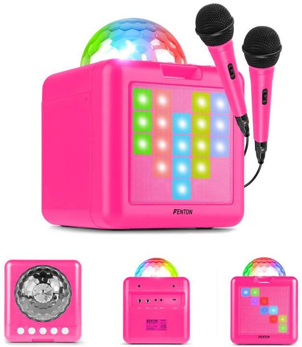 Karaoke z półkulą LED 15W głośnik bluetooth 2 mikrofony Fenton różowy Kod produktu: 130.201 KAR15P Głośnik Karaoke z 2 mikrofonami różowy Super zabawa karaoke z KAR15! Przesyłaj dźwięk bezprzewodowo przez BT i wybieraj spośród czterech efektów zmieniających głos, aby uatrakcyjnić swoje występy. …