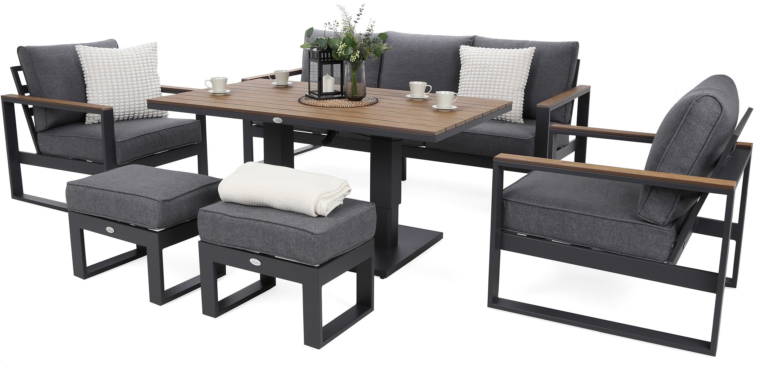 Elegancja spotyka funkcjonalność: Zestaw mebli Sorrento Polywood Szukasz mebli, które połączą nowoczesny design z bezkompromisową wygodą? Zestaw ogrodowy Sorrento Polywood to idealne rozwiązanie dla siedmiu osób, które cenią sobie wspólne chwile na świeżym powietrzu. Połączenie surowej, szarej konstrukcji z ciepłymi akcentami imitującymi drewno sprawia, że komplet ten stanie się stylowym centrum Twojego tarasu lub ogrodu.