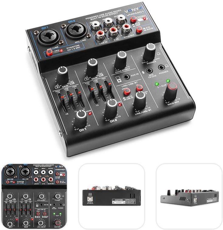 Mikser audio 4-kanałowy USB BT VMM401 Vonyx Seria VMM to linia przenośnych, funkcjonalnych mikserów z interfejsem audio USB, które umożliwiają bezpośrednie nagrywanie i transmisję dźwięku z mikrofonu lub instrumentu do komputera. VMM401 to kompaktowy 4-kanałowy mikser audio z interfejsem USB Idealny do streamingu, podcastów, nagrań muzycznych i występów na żywo. 4 kanały audio – do jednoczesnej pracy z mikrofonami, instrumentami i źródłami liniowymi Wejścia combo XLR/Jack 6,3 mm – uniwersalne porty dla mikrofonów i urządzeń audio Zasilanie Phantom 48V – pełna kompatybilność z mikrofonami pojemnościowymi Interfejs audio USB – bezpośrednie połączenie z komputerem (PC/Mac), idealne do nagrywania Zasilanie z portu USB – brak potrzeby zewnętrznego zasilacza Kompaktowa, mobilna konstrukcja – idealna do domowego studia i pracy w terenie To doskonałe rozwiązanie dla muzyków, streamerów, lektorów i wszystkich, którzy cenią mobilność, funkcjonalność i czysty dźwięk. Odbiornik Bluetooth umożliwia bezprzewodowe strumieniowanie dźwięku z Twojego smartfonu, tabletu lub komputera. Kompaktowy 4-kanałowy mikser audio USB z efektami i zasilaniem phantom Idealny do nagrań, streamingu i występów na żywo! 2 wejścia mikrofonowe XLR z zasilaniem phantom 48V – dla mikrofonów dynamicznych i pojemnościowych 2 wejścia stereo (Jack 6,3 mm) – do podłączenia instrumentów, klawiatur, odtwarzaczy audio itp. 2-pasmowy korektor EQ – precyzyjna regulacja tonów wysokich i niskich Regulacja panoramy (balansu kanału) – ustawienia lewego/prawego kanału dla każdego toru Wbudowany efekt echa – dodaj przestrzeni i głębi dźwiękowi w czasie rzeczywistym Plug & Play – szybka i łatwa konfiguracja, bez potrzeby instalacji sterowników Zasilanie przez USB lub zewnętrzny zasilacz (DC 5V) – elastyczne opcje zasilania Zasilanie phantom 48V – obsługa mikrofonów pojemnościowych Opis produktu Mikser z wbudowaną kartą dźwiękową USB 2 wejścia Combo Jack/XLR 2 kanały wejściowe stereo RCA z regulacją poziomu Główne wyjście RCA Kanał 1 i 2 z korektorem/panoramą Efekt echa Odbiornik BT do bezprzewodowego strumieniowania dźwięku Wyjście słuchawkowe 3,5mm Zasilanie Phantom (+48V) na kanale 1 i 2 Wytrzymała metalowa obudowa Zasilany przez USB lub zewnętrzny zasilacz (w zestawie) Dane techniczne Opcje odtwarzania Przesyłanie strumieniowe BT Połączenia wejściowe Jack 3,5mm, Jack 6,3mm, RCA, XLR (3-stykowe) Połączenia wyjściowe Jack 3,5mm, RCA, USB Rodzaj efektów Echo Pasmo przenoszenia 20Hz- 20 000Hz THD <0,5% Korektor 2-pasmowy Korektor: niski +/- 15dB Korektor: wysoki +/- 15dB Zasilanie 100- 240VAC 50/ 60Hz (5V USB) Wymiary (dł. x szer. x wys.) 136x 134x 41mm Waga 0,55kg Wbudowana karta dźwiękowa USB oraz wyjście słuchawkowe – możliwość bezpośredniego monitorowania dźwięku i nagrywania na komputerze (PC/Mac)