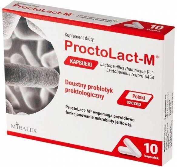 Proctolact-M Probiotyk Proktologiczny Miralex 10 kapsułek Suplement diety ProctoLact-M® doustny probiotyk proktologiczny, który wspomaga prawidłowe funkcjonowanie mikrobioty jelitowej oraz przewodu pokarmowego – w szczególności końcowego odcinka odbytnicy. Przywrócenie równowagi bakteryjnej jelit znacząco wpływa na prawidłowe funkcjonowanie organizmu, w tym układu odpornościowego. ProctoLact-M® zawiera specjalnie dobraną kompozycję dwóch żywych szczepów bakterii probiotycznych – Lactobacillus rhamnosus PL1 i Lactobacillus reuteri 5454. Szczepy te hamują namnażanie się chorobotwórczych mikroorganizmów, które są przyczyną zaburzeń prawidłowej pracy przewodu pokarmowego. W badaniach in vitro potwierdzono szereg korzystnych właściwości szczepów bakterii z rodzaju Lactobacillus obecnych w produkcie ProctoLact-M®: działanie antagonistyczne w stosunku do bakterii, takich jak Enterococcus faecalis, patogenne szczepy Escherichia coli, Klebsiella pneumoniae, Streptococcus agalactiae, powodujących stany zapalne odbytu i rozwój ran okołoodbytowych oporność na kwas solny i sole żółci, co umożliwia przeżywanie pasażu (przemieszczania się) przez żołądek i jelito cienkie silne przyleganie (adhezja) do komórek nabłonka jelita grubego, w tym odbytnicy i odbytu. Jak stosować ProctoLact-M Doustny Probiotyk Proktologiczny? dzieci od 3. roku życia: 1 kapsułka 1 raz dziennie, dorośli i dzieci powyżej 12. roku życia: 1 kapsułka 1-2 razy dziennie. Stosować doustnie. Kapsułkę połknąć popijając 100 ml (połowa szklanki) letniej wody W przypadku braku możliwości połknięcia, zawartość kapsułki można zmieszać z pokarmem lub chłodną wodą. ProctoLact-M® najlepiej spożywać w trakcie posiłku (zapewnia to wyższą przeżywalność bakterii zawartych w preparacie). Nie należy przekraczać zalecanej porcji do spożycia w ciągu dnia. Suplement diety nie może być stosowany jako substytut (zamiennik) zróżnicowanej diety. Ważne jest prowadzenie zdrowego trybu życia i zrównoważonego sposobu odżywiania. Czas stosowania Dla utrzymania właściwej równowagi mikrobioty jelit, w tym odbytnicy i odbytu – ProctoLact-M® powinien być stosowany nie krócej niż 10 dni. ProctoLact-M skład substancja wypełniająca – maltodekstryna ziemniaczana; inulina z korzenia cykorii; kapsułka – hydroksypropylometyloceluloza; liofilizowane żywe kultury bakterii (Lactobacillus rhamnosus PL1 i Lactobacillus reuteri 5454); substancja przeciwzbrylająca – dwutlenek krzemu; kwas L-askorbinowy (witamina C). Nie zawiera tłuszczu. Wysoka zawartość błonnika pokarmowego (inulina). Masa netto podana na opakowaniu Suplementy diety nie mogą być stosowane jako substytut (zamiennik) zróżnicowanej diety ani zdrowego trybu życia. Nie należy przekraczać zalecanej porcji produktu do spożycia w ciągu dnia. Suplementy diety powinny być przechowywane w sposób niedostępny dla małych dzieci. Przed zastosowaniem produktu sugerujemy zapoznanie się z dokładnymi informacjami podanymi na opakowaniu lub załączonej ulotce. Warunki przechowywania Przechowywać w szczelnym opakowaniu. W suchym i chłodnym miejscu, w sposób niedostępny dla dzieci. Chronić przed światłem. Producent MIRALEX SP. Z O.O.
