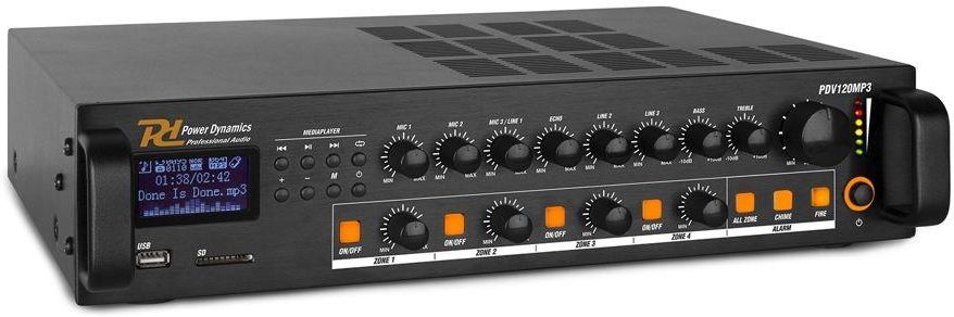 WZMACNIACZ 4strefowy PA 240W 100V 8Ohm BT USB FM Cała seria dedykowana jest instalacją w bankach, supermarketach, szkołach, hotelach, restauracjach, urzędach, biurach i wszelkich publicznych miejscach. Kod produktu: 952.071 Wzmacniacz 100V z regulowanymi strefami Wzmacniacz liniowy Power Dynamics PDV240MP3 100v posiada 4 strefy, które można aktywować i dezaktywować niezależnie od siebie. Głośność można regulować niezależnie, strefa po strefie. Te ustawienia ułatwiają skonfigurowanie wielostrefowego systemu dźwiękowego do odtwarzania muzyki lub ogłoszeń komercyjnych. Tuner FM, streaming audio bluetooth i USB Wzmacniacz 100V oferuje bardzo kompletne połączenia, aby transmitować to, co chcesz. PDV240MP3 jest szczególnie wyposażony w połączenie Bluetooth, idealne do strumieniowego przesyłania muzyki ze smartfona lub tabletu. Dodatkowo możesz podłączyć nośnik USB lub kartę SD i odtwarzać ulubioną muzykę w formacie MP3. Jest również wyposażony w tuner radiowy FM. Priorytet mikrofonowy wzmacniacz 100v PDV240MP3 ma funkcję priorytetową na wejściu mic 1. Oznacza to, że gdy tylko użyjesz mikrofonu, cała pozostała muzyka jest tłumiona, dzięki czemu słychać tylko twoją wiadomość na mikrofonie. Potem muzyka przejmuje kontrolę. Idealny dla banków, centrów handlowych, miejsc publicznych Dzięki funkcjom dystrybucji muzyki w 4 strefach i niezależnym ustawieniom, a także funkcji priorytetowego mikrofonu, wzmacniacz 100V doskonale nadaje się do sklepów. Rzeczywiście, masz wszystkie funkcje do strumieniowego przesyłania muzyki i mówienia w przypadku ogłoszenia na mikrofonie. Ponadto styki 24V można podłączyć do centrali przeciwpożarowej, aby w razie potrzeby skonfigurować systemy ewakuacji awaryjnej. Opis produktu Wzmacniacz z 4 strefami, z niezależnym wybieraniem i kontrolą dźwięku Zintegrowany odtwarzacz z tunerem FM, slotem USB oraz SD Odbiornik Bluetooth Ochrona przed przeciążeniem Dzwonek i sygnał alarmu przeciwpożarowego na wszystkich kanałach 6-ścio stopniowa regulacja głośności strefy Regulacja wysokich i niskich tonów 3x wejście mikrofonowe oraz 3x wejście liniowe Przywoływanie telefoniczne 19" mocowanie z możliwością załączenia uchwytów (2U) Możliwość pracy na zapasowym akumulatorze 24V (nie jest dołączony do produktu) Dane techniczne Model: PDV240MP3 Funkcje odtwarzania: Bluetooth, FM-Radio, SD-Card, USB Moc wyjściowa RMS: 240W Impedancja: 100V, 8ohm Pasmo przenoszenia: 50Hz- 19.000Hz Stosunek sygnału do szum:u >70dB Zasilanie: 220- 240VAC 50Hz Wymiary: 415x 318x 88mm Waga: 11kg
