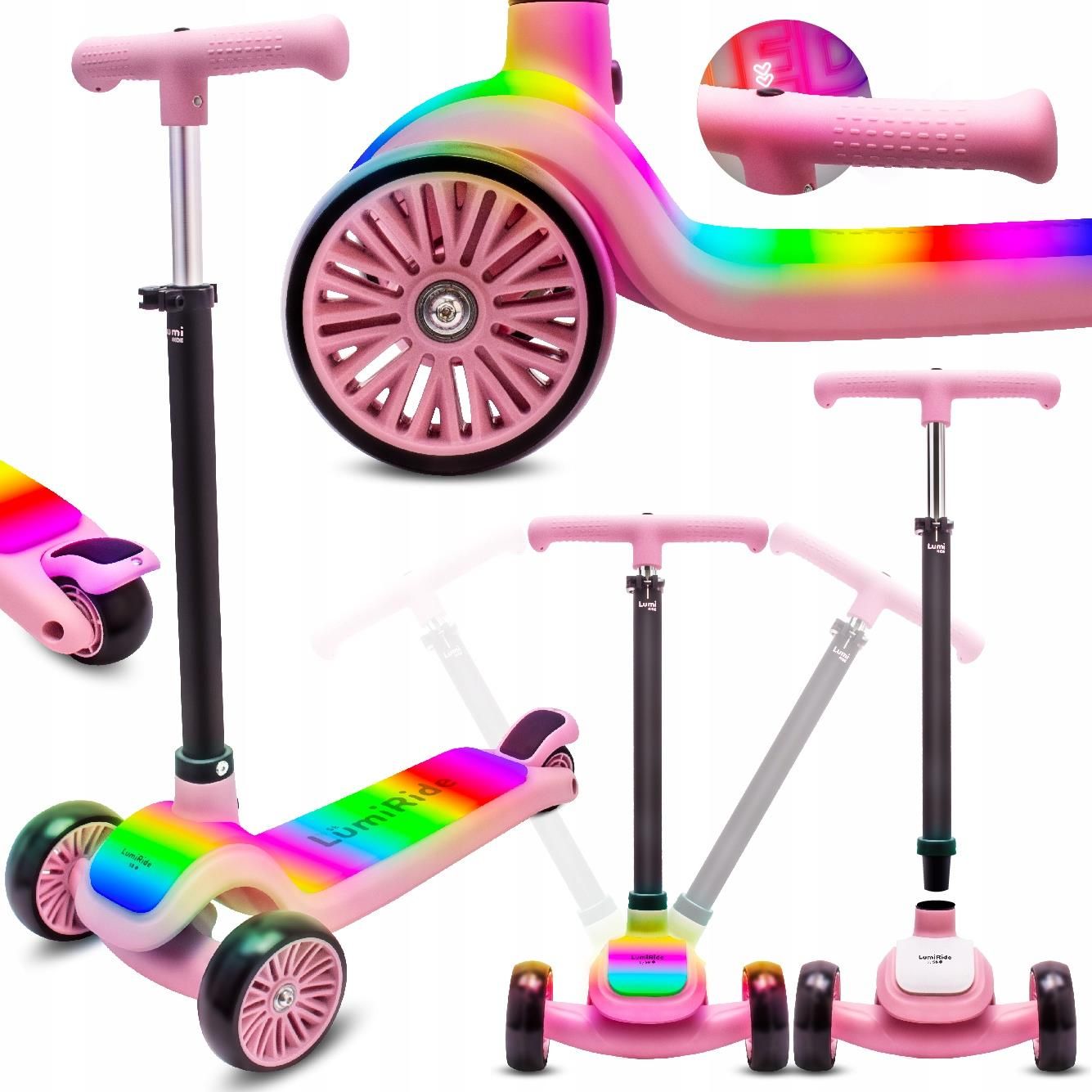 Hulajnoga trójkołowa balansowa składana regulowana Platforma Lumiride LED 7 kolorów 20 programów różowy Sun Baby Cechy produktu wiek: 3+ maksymalne obciążenie: AŻ DO 50 kg materiał kół: PU średnica kół: 12 cm przód; 7 cm tył materiał rękojeści: TPR zakres regulacji hulajnogi (mierzony od ziemi): …