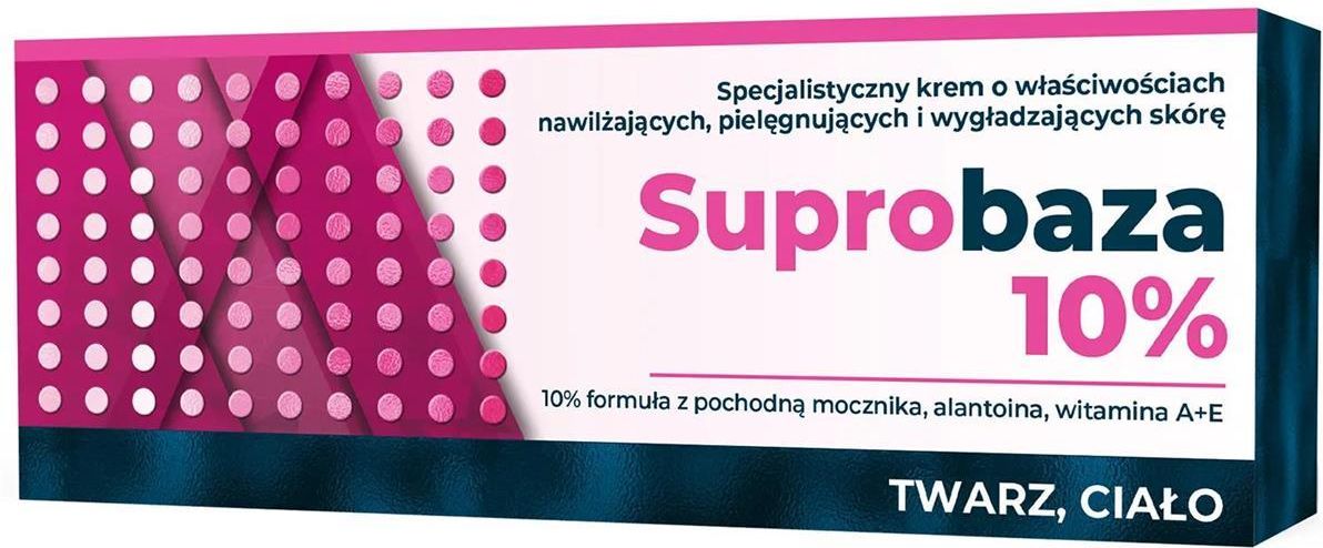 Zastosowanie Suprobaza 10% krem Suprobaza 10% krem to specjalistyczny kosmetyk przeznaczony do nawilżania, wygładzania i pielęgnacji skóry całego ciała, również twarzy. Wykazuje delikatne właściwości złuszczające martwe komórki naskórka oraz wzmacniające barierę ochronną tkanki. Efekt działania Suprobaza 10% krem Suprobaza 10% krem to krem nawilżający i wygładzający, którego zaawansowana formuła opiera się na działaniu starannie dobranych składników aktywnych. Mocznik intensywnie nawilża i pomaga utrzymać prawidłową wilgotność naskórka, a emolienty tworzą na powierzchni skóry niewidoczny film ochronny, zapobiegając nadmiernej utracie wody. Alantoina łagodzi podrażnienia oraz wspomaga procesy regeneracyjne, a witamina A delikatnie złuszczająca martwy naskórek, wspierając odbudowę tkanki i poprawiając jej strukturę. Witamina E to silny antyoksydant, który chroni komórki skóry przed działaniem wolnych rodników, opóźniając tym samym procesy starzenia. Suprobaza 10% krem skutecznie zmiękcza i wygładza skórę, nadając jej jedwabistą gładkość. Skład Aqua, Isopropyl Myristate, Paraffinum Liquidum, Propylene Glycol, Cetearyl Alcohol, Hydroxyethyl Urea, Glyceryl Stearate Citrate, Allantoin, Glyceryl Caprylate, Phenoxyethanol, Tocopheryl Acetate, Disodium Hydrogen Phosphate Dodecahydrate, Retinyl Palmitate, Ethylhexylglycerin, Citric Acid Pojemność: 30 g. Środki ostrożności Nie należy stosować w przypadku stwierdzonej nadwrażliwości na którykolwiek ze składników produktu. Jak każdy produkt kosmetyczny, również ten może wywoływać działania niepożądane. W razie ich wystąpienia należy zaprzestać jego stosowania, a także skonsultować się z lekarzem. Produkt nie do spożycia. Nie stosować na zranioną skórę. Produkt nie jest przeznaczony dla dzieci poniżej 3. roku życia. Sposób użycia Nanosić niewielką ilość kremu na wybrane obszary ciała. Wmasować i pozostawić do wchłonięcia. Stosować 1-2 razy dziennie, w zależności od potrzeb. Dodatkowe informacje Przechowywać w suchym i chłodnym miejscu, niedostępnym dla dzieci. Zużyć w ciągu 12 miesięcy od otwarcia. Suprobaza 10% krem możecie kupić na stronie apteki internetowej www.apodiscounter.pl.