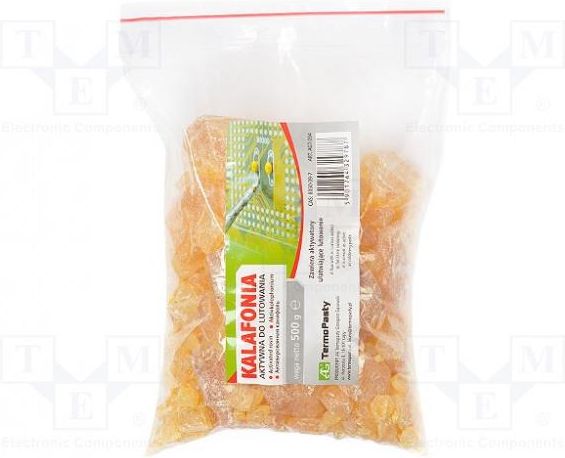 Kalafonia 500g AG Opis Kalafonia firmy AG Termopasty jest stosowana jako baza do topnika wzorcowego, gdzie stanowi 25% roztworu w alkoholu izopropylowym. Nie jest pastą lutowniczą, ale jej aktywność posiada zbliżoną wartość. Doskonale nadaje się do lutowania stopem cynowo-ołowiowym. Bardzo często wykorzystuje się ją do nacierania włosia smyczków, aby zwiększyć przyczepność do strun. Lutownictwo i spawalnictwo to nie jedyne obszary, w których kalafonia znajduje zastosowanie. Przydaje się także w poligrafii, ponieważ może być składnikiem lakierów i farb. Zastosowanie bardzo dobry topnik podczas lutowania stopem cynowo-ołowiowym używana do nacierania włosia instrumentów smyczkowych w celu zwiększenia szorstkości i tym samym zwiększenia jego przyczepności do strun jako spoiwo w farbach poligraficznych które jednocześnie polepsza jej właściwości składnik lakierów, pokostów, mydeł, laku, tworzyw sztucznych, gumy Właściwości Temperatura mięknienia: 78°C Liczba kwasowa: 160 do 190 mgKOH/g Zawartość popiołu: 0,04% Liczba jodowa: 5 do 25 gI2/100g Liczba zmydlania: 170 do 220 mgKOH/g Zawartość tłuszczów lotnych: 2% Pojemność: 500 g Opakowanie: torebka strunowa