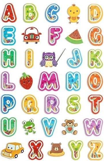 Naklejki z pianki z kolorowymi literkami: alfabetem uzupełnione kilkoma wizerunkami zwierzątek . Naklejki piankowe są doskonałym elementem rozwoju kreatywnej aktywności dziecięcej. Sprawdzą się w różnorodnych pracach plastycznych, laurkach, kartkach okolicznościowych, albumach czy do oklejania zeszytów. Liczba naklejek w opakowaniu: 35 szt. Wielkość blistra: 14 x 21 cm Wielkości naklejek: ok 2 x 2 cm; grubość ok 2 mm Cechy szczególne: z brokatowym wykończeniemo