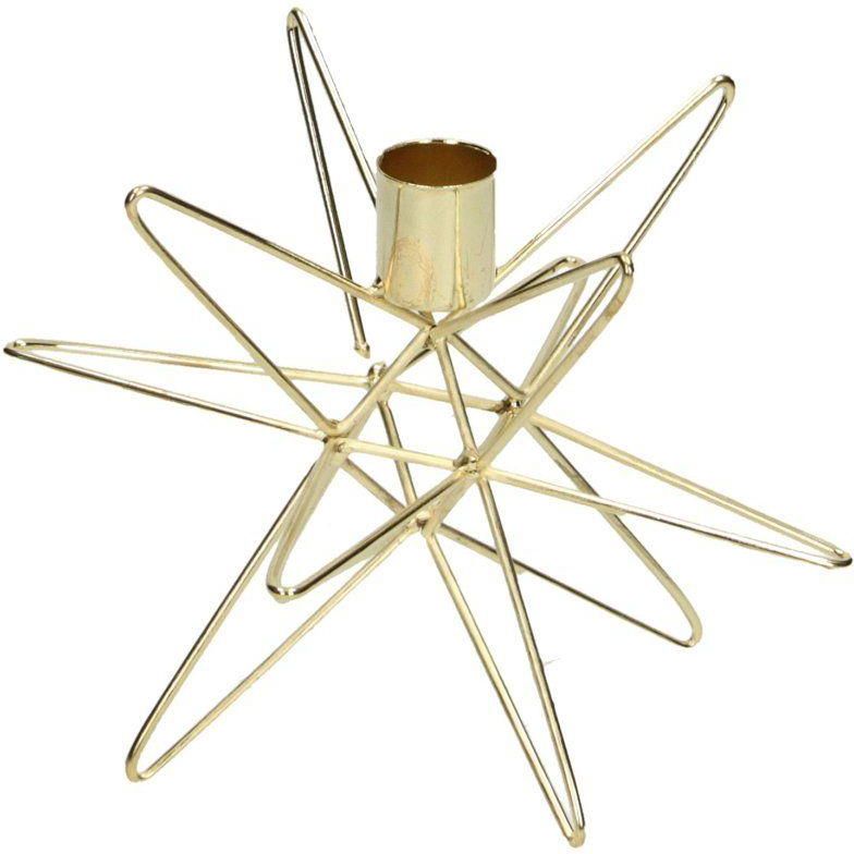 Ostatnia sztuka !!!! Oryginalny, minimalistyczny świecznik wykonany z metalu. Lekka, przestrzenna konstrukcja przypomina kształtem gwiazdkę. Świecznik Galactic to niebanalny i efektowny sposób na wyeksponowanie klasycznej świecy, a także wspaniały pomysł na stylowy upominek. Doskonały dodatek do nowoczesnych wnętrz. Wymiary: szer. 18cm, gł. 18cm, wys. 13cm. Materiał: metal. Kolor: złoty. Waga: 0,1kg.
