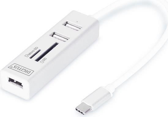 HUB/Koncentrator DIGITUS 3-portowy OTG USB Typ C czytnik kart SD/Micro SD HUB 3-portowy OTG USB Typ C czytnik kart SD/Micro SD USB 2.0 Porty wejścia: USB Type-C Porty wyjścia: Czytnik kart microSD Porty wyjścia: Czytnik kart SD Porty wyjścia: USB 2.0 x3 Łączna ilość wyjść USB: 3 Kolor obudowy: Srebrny (Silver) Wymiary [W x S x G] (mm): 81 x 23 x 16 mm Informacje dodatkowe: Przesył danych w prędkościach High-Speed (480 Mbps) i Full-Speed (12 Mbps) Informacje dodatkowe: Elegancka aluminiowa obudowa Informacje dodatkowe: Hub i czytnik kart przez port USB 2.0 z funkcją OTG Informacje dodatkowe: Kompatybilność z Mac OS, Windows 10, Google Chrome OS i Android Informacje dodatkowe: Długość kabla: 15cm