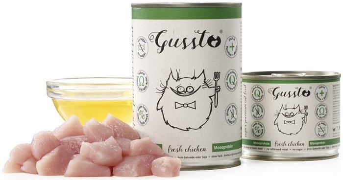 Gussto Fresh Chicken Pełnoporcjowa, bezzbożowa karma dla kotów w każdym wieku. Karma produkowana jest z najwyższej jakości składników, zawiera 70% pełnowartościowego mięsa oraz podrobów kurczaka. Prosty skład zapewnia całkowite pokrycie potrzeb żywieniowych kotów jako gatunku. Karma nie zawiera zbóż, ani innych składników nietolerowanych przez koty. Wywar własny z mięsa zwiększa smakowitość i nadaje karmie charakterystycznej konsystencji za którą koty przepadają. Olej z ostropestu zwiększa tłustość, podpasuje więc nawet kotom wybrednym. Wysoka zawartość mięsa odpowiada za dobre trawienie i prawidłową kondycję organizmu. Karma zawiera odpowiednią zawartość tauryny - aminokwasu egzogennego, niezbędnego w żywieniu kotów. Odpowiada on za zdrowy wzrok i serce kota, wzmacnia kondycję całego organizmu i poprawia witalność. Jest konieczny dla utrzymania sierści kota w pięknym stanie. Jako karma monobiałkowa sprawdzi się przy kotach z nietolerancjami pokarmowymi, alergiamii, a także jako podstawa diety eliminacyjnej. Polega ona na podawaniu tylko jednego rodzaju białka pochodzenia zwierzęcego przez okres ok. 4 miesięcy w celu sprawdzenia jak organizm kota na nie reaguje. Najważniejsze cechy: Bezzbożowa - nie zaburza trawienia. Wysoki udział mięsa, dodatek podrobów - odpowiednie proporcje w żywieniu kotów. 2000 mg tauryny dla mocnego wzroku, serca, pięknej sierści i silnej odporności. Konsystencja mielonki - w puszcze lub wilgotnego pasztetu - w saszetce Monobiałkowa.   Skład: 70% Kurczak (w tym ok. 2/3 mięso mięśni i serca, ok 1/3 wątroba, żołądki i szyjki), 28,8% wywar własny z mięsa, 1% minerały, 0,2% olej z ostropestu Analiza: Białko: 10,8%, tłuszcz: 6,2%, popiół surowy: 2,4%, włókno surowe: 0,4%, wilgotność: 80% Zrównoważony stosunek wapno/fosfor: 1,14/1 Dodatki na 1 kg: Witamina D3: 220 IE, witamina E: 33 IE, cynk jako siarczan cynku, monohydrat: 16,5 mg, mangan jako siarczan manganu (II), monohydrat: 3,3 mg, jod jako jodan wapnia: 0,825 mg, tauryna: 2000 mg, biotyna: 330 µg Zalecenia dotyczące karmienia: Masa ciała kota:     Dzienna dawka: 2Kg                       150G 4Kg                       200G 6Kg                       250G Podane porcje są orientacyjne. Należy dopasować je do kota, tak aby utrzymać jego prawidłową masę ciała. Dawki w zależności od aktywności, stanu zdrowia, kondycji, wieku i tendencji do tycia kota, można zwiększać lub zmniejszać o 10 - 15%. Po otwarciu przechowywać w lodówce i zużyć w ciągu 2 dni. Zaleca się podawanie w temperaturze pokojowej, można rozrozbić z odrobiną wody. Niezjedzony pokarm po wyschnięciu wyrzucić. Miski regularnie myć. Wprowadzają karmę po raz pierwszy do menu kota zaleca się przeprowadzić okres przejściowy, podczas którego miesza się poprzednią karmę z nową. Najlepiej wprowadzać ją od 3 do 6 dni. Zapewnić kotu dostęp do świeżej wody pitnej.