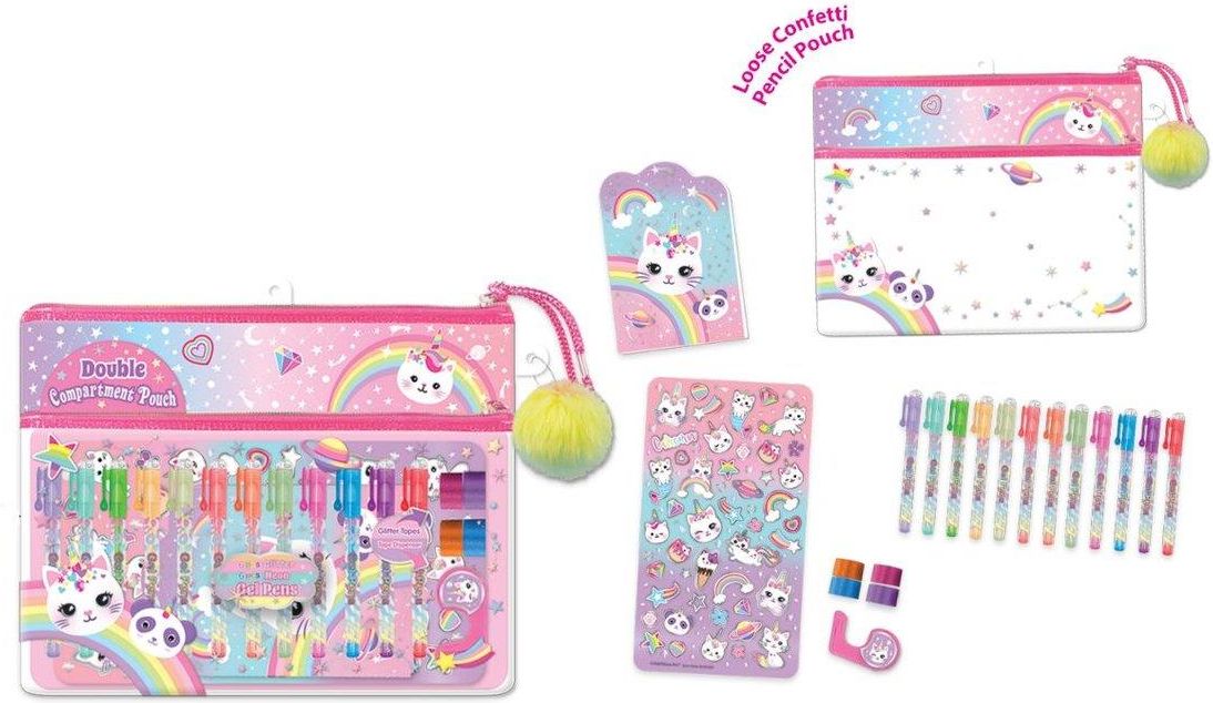 Wielobarwny Zestaw Żelowych Długopisów Odkryj zestaw kolorowych żelowych długopisów, który wyróżnia się różnorodnością. W eleganckiej saszetce znajdziesz: 6 brokatowych długopisów, 6 długopisów neonowych, 4 dekoracyjne mini-taśmy klejące z praktycznym dyspozytorem, poręczny notes, pachnący arkusz naklejek. Elegancka i Funkcjonalna Saszetka Zestaw zapakowany jest w przezroczystą saszetkę z dwiema przegrodami, zapewniającymi łatwą organizację. Każda kieszonka jest wyposażona w zamek błyskawiczny, co ułatwia przechowywanie akcesoriów. Saszetkę zdobi kolorowy pompon oraz sznureczek, a dodatkowego blasku dodają holograficzne mini-ozdoby, które przesypują się wewnątrz. Dla Twórczych Dusz Produkt przeznaczony jest dla osób powyżej 5. roku życia, które cenią sobie kreatywność i styl. Doskonały zarówno do szkoły, jak i domu! EAN: 842817016788