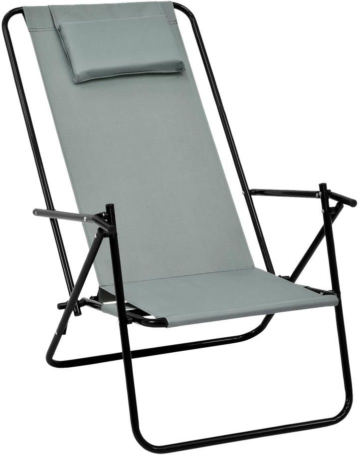 Klasyczny leżak ogrodowy z poduszką pod kark, dwupozycyjnym oparciem, uszyty z wytrzymałej tkaniny poliestrowej rozciągniętej na stalowej ramie malowanej proszkowo.