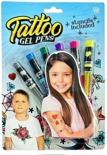 Długopisy żelowe do tatuażu, łącznie z szablonami. Przeznaczone dla dzieci w wieku od 3 lat. Wymiary: 25,2 x 17,1 x 1 cm. Waga: 414 gramów. Wymiary: 252x171 mm Grupa wiekowa: 3+ Opakowanie: pudełko