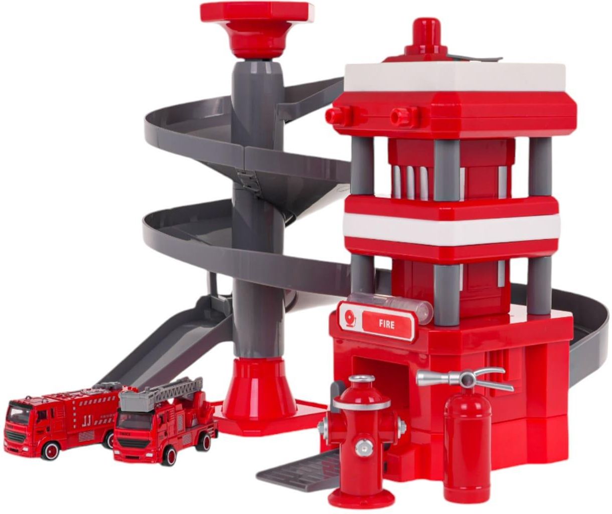 Opis Tor Straż Pożarna + Akcesoria Remiza Strażacka z funkcją wody, zjeżdżalnią i autkami strażackimi w zestawie dla dzieci od 3-go roku życia. Na dachu remizy strażackiej znajduje się pojemniczek na wodę. Po nalaniu wody do pojemniczka i naciśnięciu przycisku znajdującego się obok zbiorniczka, z przedniej części dachu będzie wydobywać się woda. Na dole remizy znajduje się garaż dla pojazdów strażackich z ruchomym szlabanem. Do zestawu dołączono dwa autka strażackie z metalową karoserią, dodatkowo drabina w jednym wozie strażackim podnosi się i opuszcza, a także wysuwa. W zestawie znajdziemy również hydrant oraz gaśnicę. Funkcje zestawu odpowiedni dla dzieci od 3-go roku życia, wykonany z najlepszej jakości plastiku, funkcja wody, autka strażackie z metalową karoserią, zjeżdżalnia dla autek strażackich, ruchome szlabany, gaśnica i hydrant w zestawie. Wymiary zestaw straż pożarna ok. 28 cm x 24 cm x 25 cm, autka strażackie ok. 7 cm x 3 cm x 2,7 cm, hydrant ok. 6 cm x 3,5 cm, gaśnica ok. 6,5 cm x 4,5 cm x 2 cm, opakowanie ok. 45 cm x 9 cm x 31,5 cm. Zawartość zestawu części konstrukcyjne zestawu Straż Pożarna, 2 x autko strażackie, hydrant, gaśnica, pipetka na wodę, lubrykant w spreyu, instrukcja obsługi.
