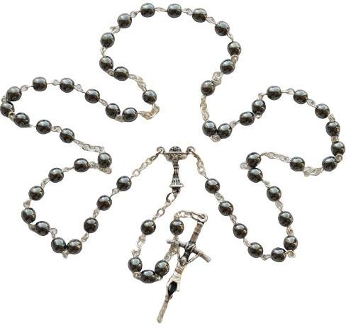 Różaniec do Pierwszej Komunii, pierwszokomunijny, możliwość noszenia na szyi. Paciorki: kulki w kolorze grafitowym Długość w obwodzie: około 55cm Średnica paciorka: 5,0 mm Zapięcie: NIE Różaniec jest na tyle długi, że można przełożyć go przez głowę