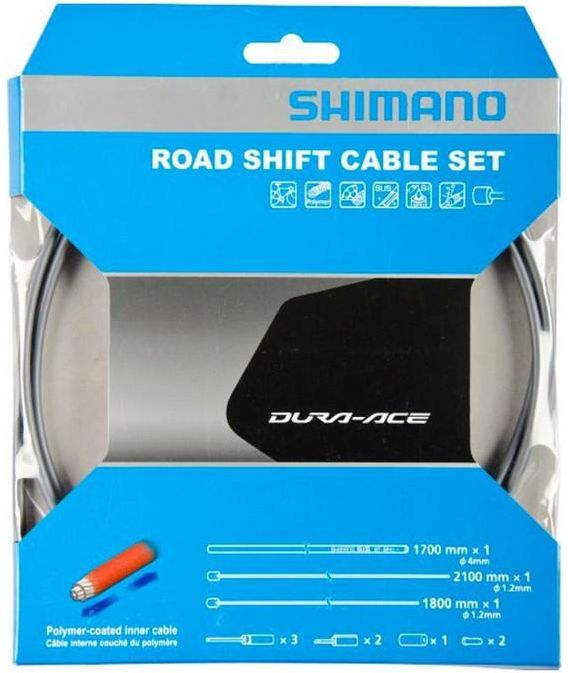 Shimano OT-SP41 Polymer pancerze i linki przerzutek R9100 + R8000 szare The secret of the Shimano OT-SP41 Polymer Shift Cable Set is polymer coating that when viewed under a microscope looks like a series of tubes wrapped around the cable. This means less surface area rubbing the internal housing liner and it holds grease longer. Features - OT-SP41 Polymer Shift Cable Set for Dura Ace R9100 and Ultegra R8000 Polymer coating Polymer coated inner cables reduce the sliding resistance to achieve lighter and quick operation Anti-rust Stainless steel cable for anti-rust protection Low friction Cables are formed with curved surface for low friction Mud resistance Sealed end caps to minimize mud contamination Silicone grease SIS SP41 is pre-lubricated with a special silicone grease for light-action shifting Produkteigenschaften Use: Road Group: Dura Ace, Ultegra Gear wire diameter: 1.2mm Gear wire lengths: 1800mm / 2100mm Gear cable diamter: 4mm Gear cable length: 1700mm Color Gear Cable grey Material Gear wire: Stainless steel, Polymer Scope of delivery 1 x Polymer inner cable 1.2mm x 1800mm 1 x Polymer inner cable 1.2mm x 2100mm 1 x OT-SP41 outer casing 4mm x 1700mm 2 x Outer cap with short tongue 3 x Outer cap with long tongue 1 x Sealed outer cap for Rear Derailleur 2 x Inner end cap 1 x Cover with tongue for rear derailleur Artykuł nr: 56074 EAN: 4524667317159