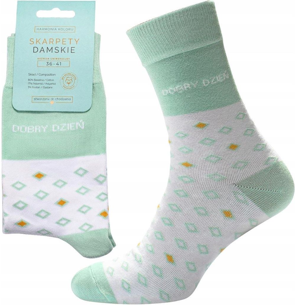 SKARPETKI DLA KOBIETY Dedykacja z napisem: DOBRY DZIEŃ Rozmiar: 36-41 Unikalna kolorystyka i design Wyprodukowane w Polsce 80% bawełna, 17% poliamid, 3% elastan SKARPETKI SĄ BARDZO WYGODNE I POZWALAJĄ SWOBODNIE ODDYCHAĆ STOPIE.