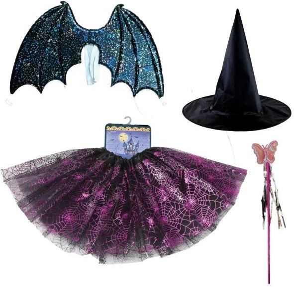 Strój czarownicy na Halloween W zestawie tiulowa spódniczka (długość 30 cm), opaska - kapelusik, różdżka, skrzydełka, ledowe światełka. Wymiary: 49,5x2x52cm EAN: 6901440128672
