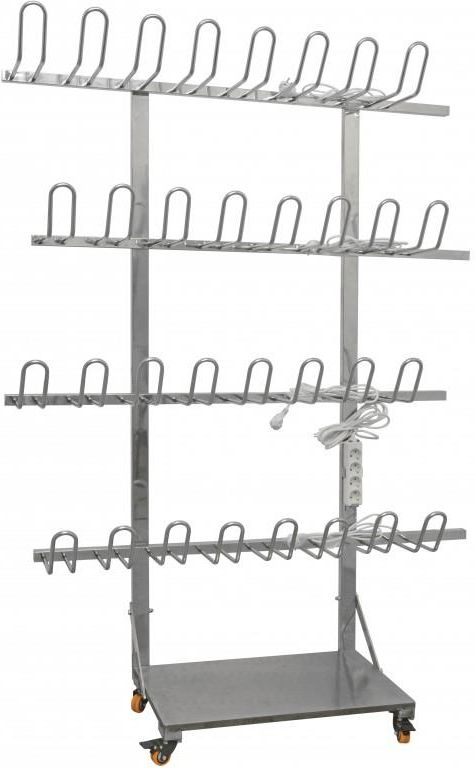 Suszarka mobilna Tempish Uniwersalna suszarka do 4x4 par łyżew16 par). Niezwykle energooszczędna suszarka do obuwia, rękawiczek, łyżew, butów narciarskich !! Prosta i skuteczna automatyczna obsługa. Nadaje się do hoteli, pensjonatów, domków letniskowych i wypożyczalni. Ta suszarka jest mobilna. Opakowanie zawiera również: śruby, nakrętki, podkładki, koła. Pobór mocy: 45 W. Łącznie: 180 W. Napięcie: 230 V / 50 Hz Temperatura pracy: 40 ° C Kabel zasilający: 3 m długości Certyfikaty: CE Materiał: Stal nierdzewna Działanie: Timer (włączanie / wyłączanie, automatyczne wyłączanie po 2 godzinach, 4 godzinach) Waga: 77 kg Rozmiar: 1910 mm * 425 mm * 1417 mm Wymiary opakowania: 1390 mm * 350 mm * 690 mm (26 kg), 1750 mm * 110 * 120 mm (9 kg), 730 mm * 430 mm * 130 mm (46 kg)