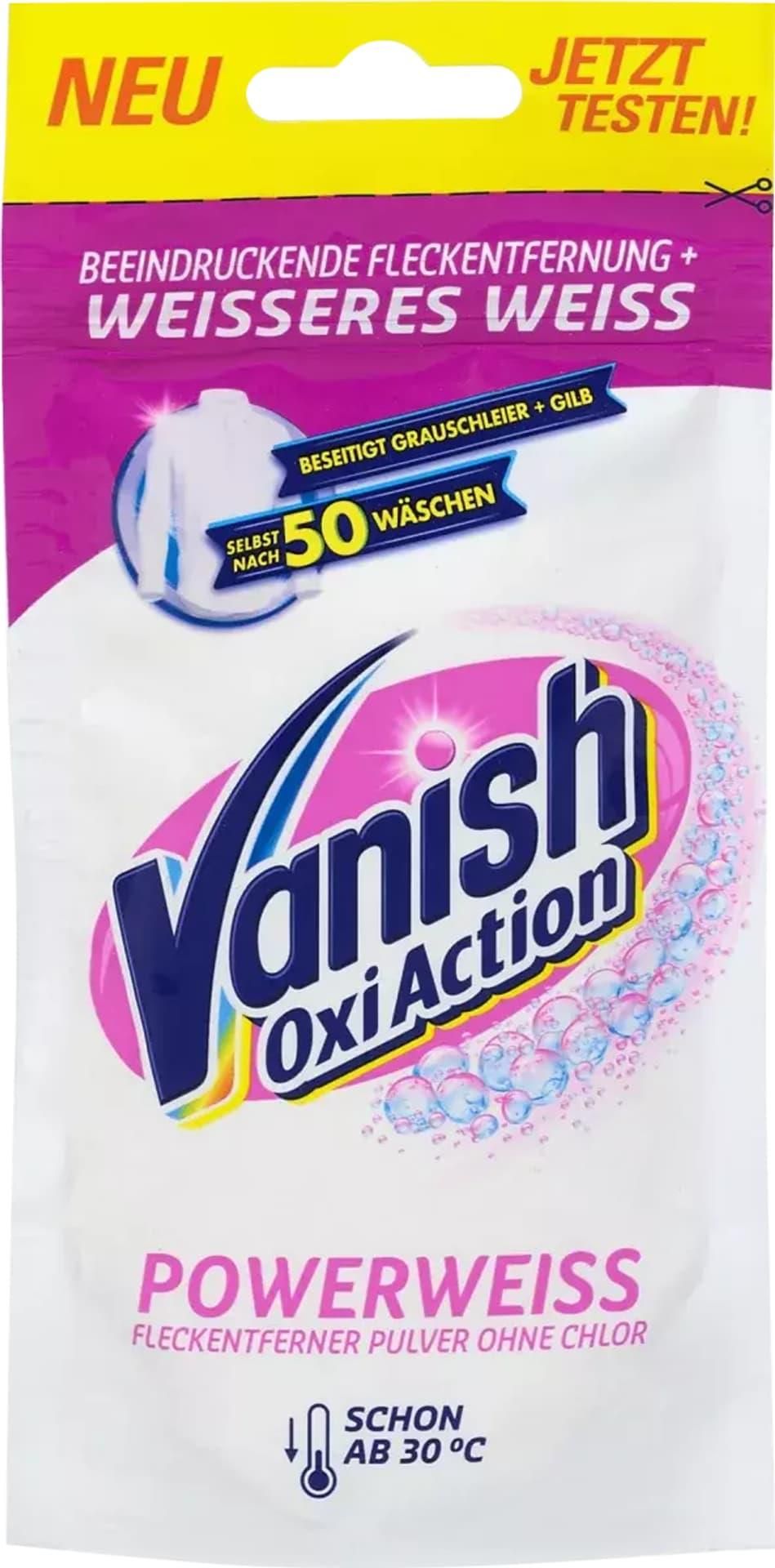 Vanish Oxi Action Power Weiss 90 g DE Dla lśniąco białego prania! Odplamiacz w proszku Vanish Oxi Action Power. Proszek niezawodnie wybiela białe tkaniny i dokładnie usuwa plamy. Dzięki silnej formule dodatek piorący usuwa szare zmętnienia i zażółcenia z niskich temperatur - nawet po 50 praniach. …