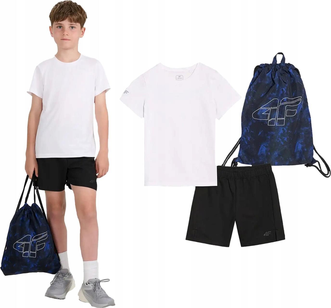 Zestaw na wf dla chłopca 4F obejmujący koszulkę, spodenki i worek na buty to jeden z podstawowych elementów szkolnej wyprawki. Komplet tworzy funkcjonalny stój na zajęcia sportowe w szkole. Koszulkę z okrągłym dekoltem z lekkim ribowaniem uszyto z szybkoschnącej tkaniny. Włókna w technologii 4FDry pomagają na bieżąco odprowadzać wilgoć. Regularny krój koszulki z obniżoną linią ramion swobodnie układa się na sylwetce zapewniając nieograniczony zakres ruchów. Spodenki posiadają standardowy krój z krótkimi nogawkami, który wygodnie dopasowuje się do sylwetki. Elastyczny pas bez regulacji stabilnie układa się na sylwetce. Spodenki uszyto z Szybkoschnącej tkaniny. Włókna w technologii 4FDry pomagają na bieżąco odprowadzać wilgoć. Komplet sportowy i obuwie treningowe można spakować do worka na buty który, dzięki zastosowaniu specjalnych szelek ze sznurka może posłużyć również jako plecak na krótką wycieczkę. Zestaw na wf to praktyczne rozwiązanie, dzięki któremu zaoszczędzisz czas i pieniądze. Materiał główny: 94% poliester, 6% elastanMateriał główny 2: 92% bawełna, 8% elastanMateriał główny 3: 100% poliester Koszulka:· Regularny krój wygodnie dopasowuje się do sylwetki· Wykonana z materiału syntetycznego, który zapewnia trwałość i jest łatwy w pielęgnacji· Dodatek elastanu sprawia, że materiał jest elastyczny i wygodnie układa się na sylwetce· Jednolita kolorystyka pasująca do wielu stylizacji· Miękka w dotyku dzianina single jersey o gładkiej powierzchni· Okrągły dekolt z lekkim ribowaniem· Obniżona linia ramion· Szybkoschnące włókna w technologii 4FDry odprowadzają wilgoć Spodenki:· Standardowy krój wygodnie dopasowuje się do sylwetki· Krótki krój· Wykonane z materiału syntetycznego, który zapewnia trwałość i jest łatwy w pielęgnacji· Rozciągliwy materiał dzięki dodatkowi elastanu· Jednolita kolorystyka pasująca do wielu stylizacji· Miękka w dotyku dzianina single jersey o gładkiej powierzchni· Pas bez regulacji· Szybkoschnące włókna w technologii 4FDry odprowadzają wilgoć Plecak-worek· Zakres rozmiarów: uniwersalny (one-size)· Wykonany z materiału syntetycznego, który zapewnia trwałość i jest łatwy w pielęgnacji· Szelki pełniące funkcję ściągacza· Uchwyt do zawieszenia na wieszaku