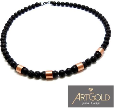 Metal : STAL 316 L Długość : 55 cm Kamienie : CZARNA LAWA Wielkość kamienia : 8 mm Inne : Efektowny naszyjnik męski wykonany z czarnej lawy wulkanicznej. Wykończony został elementami - zmatowionymi, stalowymi beadsami w kolorze różowego złota.
