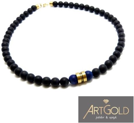 Metal : STAL 316 L Długość : 45 cm Kamienie : NATURALNY CZARNY MATOWY ONYKS, NIEBIESKI LAPIS Wielkość kamienia : 8 mm Inne : Naszyjnik wykonany z matowych, czarnych onyksów i granatowego lapisu lazuli z pozłacanym, postarzanym charmsem. Wykończony antyalericzną stalą szlachetną.