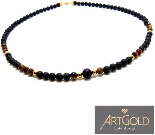 Metal : STAL 316 L Długość : 55 cm Kamienie : NATURALNY CZARNY MATOWY ONYKS, TYGRYSIE OKO Wielkość kamienia : 6 mm Inne : Niepowtarzalny naszyjnik z polerowanych kulek tygrysiego oka i onyksu z pozłacanymi elementami. Tygrysie oko opalizuje w zależności od kąta padania światła, mieni się odcieniami brązu aż po złote odcienie. Naszyjnik wykończony antyalergiczną stalą szlachetną 316L, pozłacaną trwałą i innowacyjną metodą PVD.