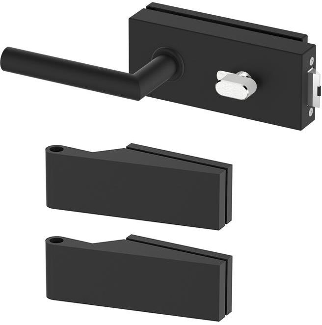 Komplet okuć do drzwi szklanych o grubości 8 mm. Blokada WC. Stal nierdzewna AISI 304, wykończenie w kolorze czarnym. Drzwi o maksymalnych wymiarach: wys. 2000 mm; szer. 800 mm. Stronność: lewa / prawa. Zawiera: zamek, klamkę,2x zawiasy do szkła.