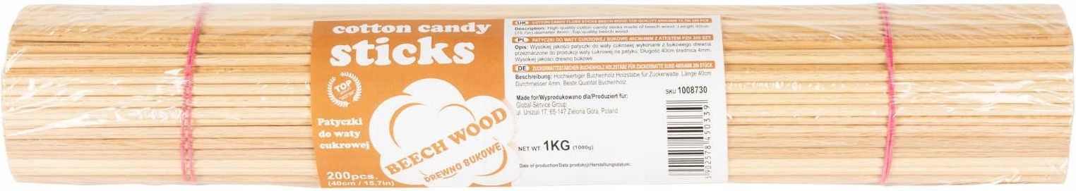 200 szt Patyczki do waty cukrowej bukowe 40cm/4mm z atestem PZH 1008730 ID produktu: 1008730 Wysokiej jakości patyczki do waty cukrowej wykonane z bukowego drewna przeznaczone do produkcji waty cukrowej na patyku. Są twarde, wytrzymałe i szorstkie dzięki czemu wata łatwiej się przykleja Aby wata dobrze się trzymała warto patyk delikatnie zwilżyć Nie mają drzazg ani zadziorów wiec korzystanie z nich jest bezpieczne. Parametry - długość: 40 cm - średnica: 4 mm - kształt: okrągły - materiał: drewno bukowe - posiadają certyfikat atest PZH ⭐⭐⭐⭐⭐ W zestawie - komplet 200 szt patyczków drewnianych do waty cukrowej