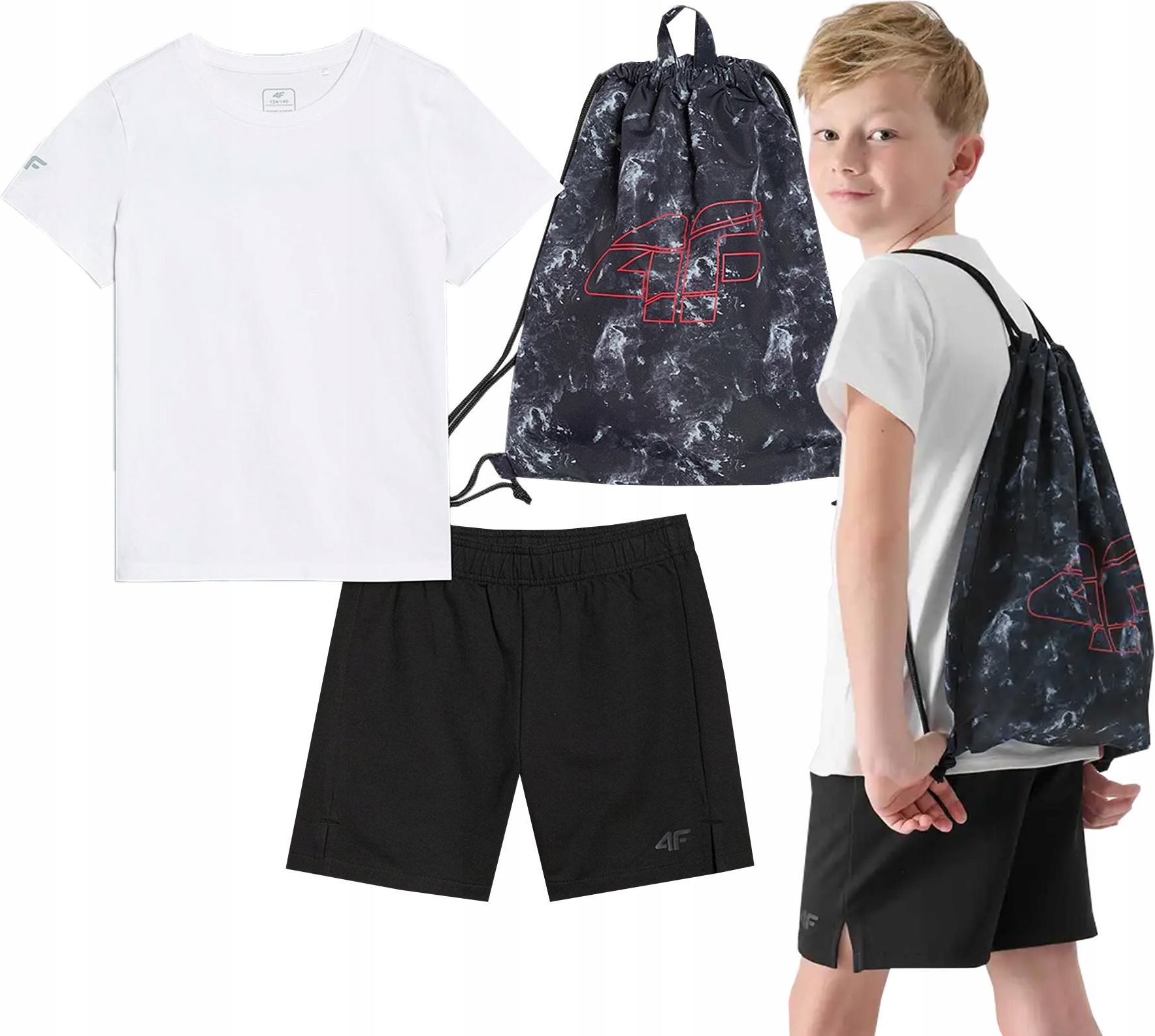 STRÓJ SPORTOWY CHŁOPIĘCY 4F NA WF TRENING M085 T-SHIRT SPODENKI 158/164 [5905700889793] Najważniejsze cechy Model: Strój Sportowy Junior Z25 TAPSM085 T-shirt Okrągły dekolt Wykonany z lekkiej i elastycznej dzianiny Spodenki Lekkie i elastyczne Elastyczna taśma w pasie Regulacja na troki Plecak-worek Nadruk na froncie Szelki ze sznurka pełniące rolę ściągacza Uchwyt do zawieszenia Dane techniczne Marka: 4F, Polska Stan: Nowy/100% oryginalny Produkt z oficjalnej dystrybucji Materiał koszulka: 100% bawełna Materiał spodenki: 95% bawełna, 5% ealastan Materiał worek: 100% poliester Kolor: Biały/Czarny/Wielokolorowy Chłopięcy komplet sportowy na WF od marki 4F składający się z koszulki, spodenek oraz worka na odzież i akcesoria sportowe. Wygodny i praktyczny zestaw, idealny na lekcje wychowania fizycznego oraz inne aktywności sportowe. Zastosowanie Lekcje wychowania fizycznego (WF) Zajęcia sportowe i rekreacyjne Treningi pozalekcyjne Codzienna aktywność ruchowa Chłopięcy komplet 4F to Kompletny zestaw: koszulka, spodenki i worek w jednym - wygoda i praktyczność. Wygoda noszenia: elastyczna dzianina i regulacja w pasie zapewniają komfort podczas ruchu. Funkcjonalny worek: idealny do przechowywania stroju i akcesoriów sportowych. Uniwersalne zastosowanie: sprawdzi się na WF i zajęciach sportowych. Łatwe utrzymanie czystości: materiały szybkoschnące i odporne na częste pranie. POLSKA MARKA 4F Marka 4F od 1995 roku projektuje oraz produkuje odzież sportową dopasowaną do trendów oraz wymagań rynku. W swojej ofercie posiada takie produkty jak: koszulki, bluzy, spodnie dresowe, kurtki oraz pełne spektrum akcesoriów: okulary przeciwsłoneczne, rękawiczki, skarpety czy torby sportowe. Produkty 4F cechuje wysoka jakość, szeroka gama kolorystyczna oraz ciekawe wzornictwo. W bogatej ofercie tej marki każdy znajdzie coś dla siebie. Razem z 4F stwórz swoją ulubioną stylizację.
