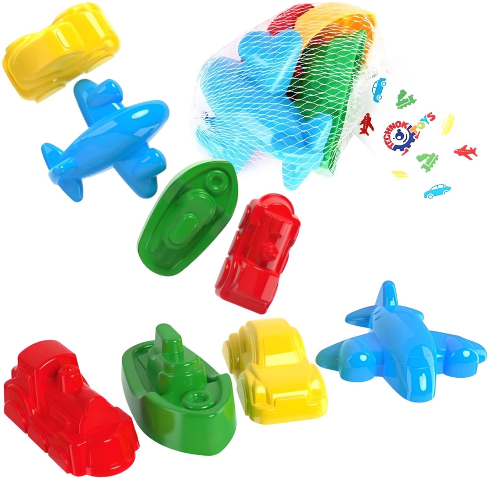Foremki do piasku TechnoK Foremki do piasku dla dzieci to świetny sposób na kreatywną i zabawną zabawę na plaży, w piaskownicy czy w ogrodzie. Zestaw zawiera 4 foremki w różnych kształtach, które dodadzą dodatkowej radości do zabawy w piasku. W skład zestawu wchodzą foremki w kształcie autka, statku, samolotu oraz lokomotywy, dzięki czemu maluchy mogą tworzyć różnorodne konstrukcje i fantastyczne historie związane z podróżami. Różnorodność foremek pozwala dzieciom rozwijać swoją wyobraźnię, a jednocześnie doskonalić zdolności manualne poprzez formowanie i układanie piaskowych kształtów. Foremki są w różnych kolorach, co dodaje estetyki i kolorowej atrakcyjności do zabawy. Kiedy dzieci używają tych foremek, nie tylko bawią się w tworzenie różnych kształtów, ale także uczą się współpracy, dzieląc się foremkami z innymi dziećmi i tworząc wspólne dzieła sztuki z piasku. Foremki do piasku to nie tylko świetna rozrywka, ale także sposób na rozwijanie zdolności twórczych, społecznych i manualnych u najmłodszych. Zabawa w formowanie piasku staje się jeszcze bardziej ekscytująca i atrakcyjna dzięki tym uroczym foremkom.Produkt jest bezpieczny, wykonany z wysokiej jakości materiałów. W zestawie 4 foremki w kształcie pojazdów.Wiek: 1+