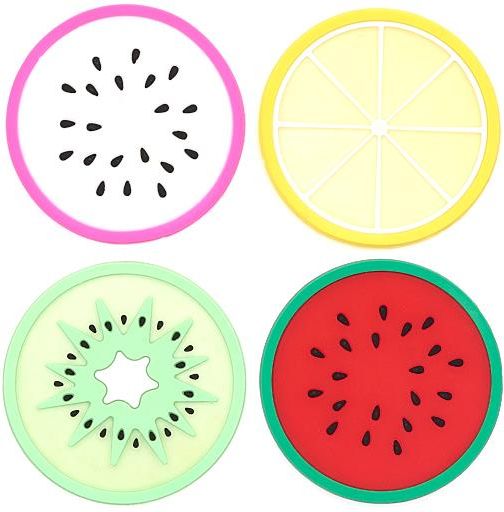 Podkładki silikonowe 8 cm owoce zestaw 4 szt. 7677 Zestaw podkładek silikonowych o wzorach przedstawiających plastry różnych owoców. Idealnie sprawdzające się jako podstawki pod kubki, szklanki oraz naczynia zarówno z napojami gorącymi jak i zimnymi. Nie ślizgają się i ściśle przylegają do każdego …