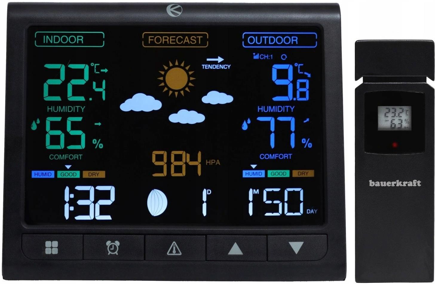 BEZPRZEWODOWA STACJA POGODOWA Bezprzewodowy pomiar temperatury wewnętrznej i zewnętrznej (zakres temperatury zewnętrznej od -40°C do 70°C) Bezprzewodowy pomiar wilgotności powietrza wewnątrz i na zewnątrz (zakres 10%-99%RH) Bezprzewodowy czujnik z zasięgiem do 30 m Kolorowy wyświetlacz LCD z 3-poziomową regulacją jasności Prognoza pogody na 12-24h Radiowo sterowany zegar z budzikiem i kalendarzem PRECYZYJNE POMIARY I NOWOCZESNA TECHNOLOGIA Ta nowoczesna, bezprzewodowa stacja pogodowa to niezawodne narzędzie do monitorowania warunków atmosferycznych, które sprawdzi się zarówno w domu, jak i w biurze. Stacja jest wyposażona w radiowo sterowany zegar, który automatycznie synchronizuje się z sygnałem czasu, eliminując konieczność ręcznego ustawiania godziny. To szczególnie przydatna funkcja, zapewniająca zawsze precyzyjne wskazanie czasu, bez względu na zmiany stref czasowych czy przestawienie zegara na czas letni i zimowy. Czytelność informacji gwarantuje duży, kolorowy wyświetlacz LCD z możliwością regulacji jasności. Dzięki temu, wartości są doskonale widoczne zarówno w ciągu dnia, jak i w nocy, co sprawia, że stacja jest idealnym rozwiązaniem dla osób w każdym wieku, w tym seniorów. FUNKCJONALNOŚĆ I DETALE Barometr - możesz na bieżąco monitorować ciśnienie atmosferyczne i przewidywać zmiany pogody. Pomiar wilgotności powietrza - zarówno wewnątrz, jak i na zewnątrz pozwala na lepszą kontrolę komfortu w domu. Wbudowana pogodynka - zapewnia szczegółową prognozę na najbliższe 12-24 godziny, ułatwiając planowanie dnia. Radiowo sterowany zegar - automatycznie synchronizuje czas. Budzik z funkcją drzemki - gwarantuje, że zawsze wstaniesz na czas. Kalendarz - ułatwia organizację codziennych obowiązków. Fazy księżyca - idealne rozwiązanie dla miłośników astronomii i osób wrażliwych na cykliczne zmiany natury. DOKŁADNE POMIARY W CZASIE RZECZYWISTYM Umieszczony w dowolnym miejscu czujnik zewnętrzny, bezprzewodowo przesyła do naszej stacji aktualne informacje odnośnie temperatury oraz wilgotności powietrza. Jego zasięg to 30 m – bez problemu sprawdzi się w dużym domu. Czujnik posiada również wyświetlacz, na którym możemy zobaczyć temperaturę oraz wilgotność powietrza. WYMIARY Szerokość: 13,9 cm Głębokość: 2,4 cm Wysokość: 11,4 cm SPECYFIKACJA Materiał: Tworzywo sztuczne Typ zasilania urządzenia: bateryjne i sieciowe Zasilanie: 5x AAA Zakres pomiaru wilgotności: 10%-99%RH Zakres temperatury wewnętrznej: 0°C do 50°C Zakres temperatury zewnętrznej: -40 ° C do 70 ° C Pomiar wartości: zewnętrzny i wewnętrzny Format temperatury: °C i °F Zasięg łączności z nadajnikiem: 30 metrów Wyświetlacz: LCD Waga: 0,4 kg Wymiar opakowania: 15x12,5x8 cm Kod produktu: G-967