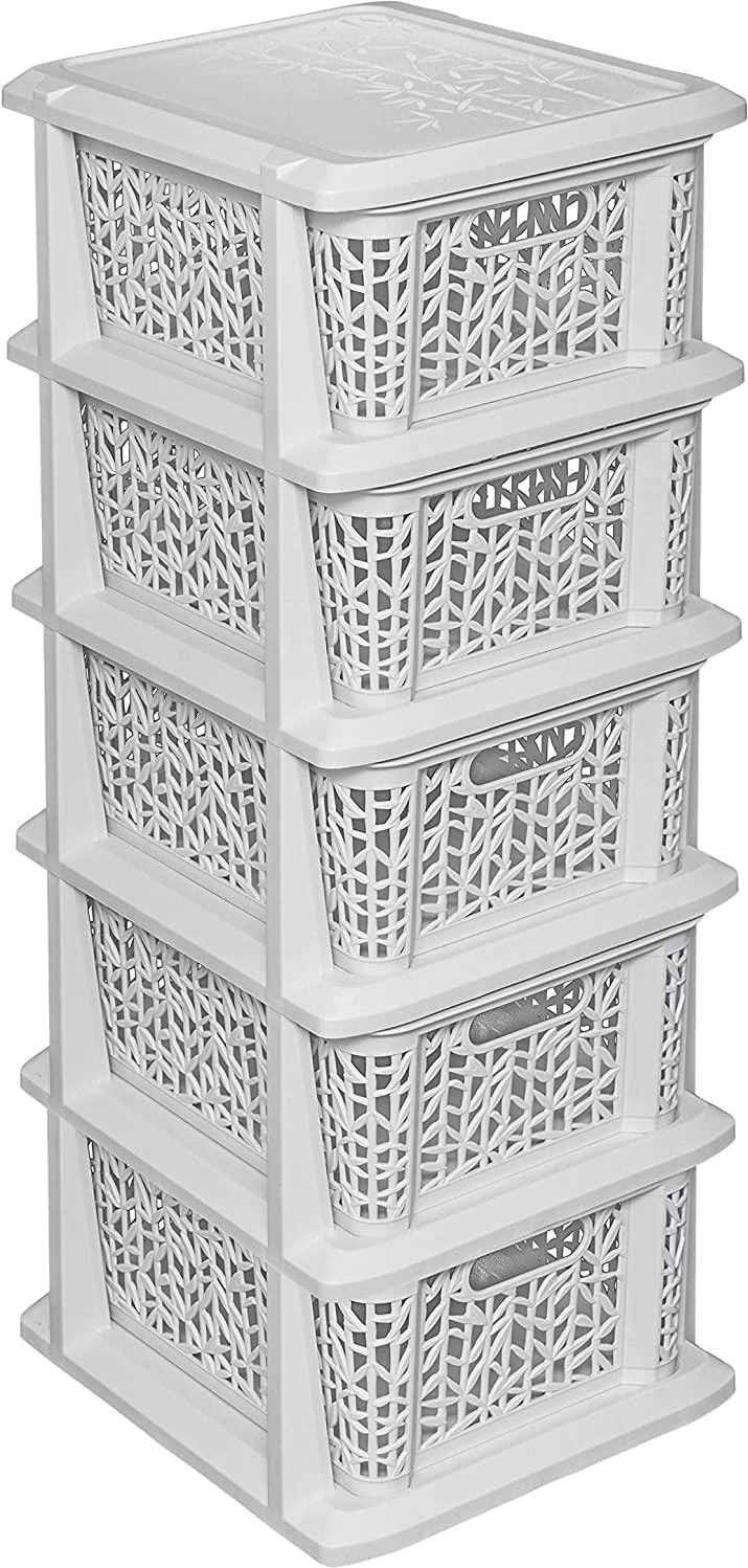 ✅ BRANQ - Regał łazienkowy Bamboo - 5x kosze - komoda - biel antyczna ✨ Informacje podstawowe Pięcioczęściowy regał z motywami gałązek i listków bambusa jest bardzo dobrym rozwiązaniem do przechowywania w małych przestrzeniach. Wykonany jest z wysokiej jakości, bardzo estetycznego bezpiecznego materiału (wolnego od ftalanów i bpa). Idealnie pasuje do takich pomieszczeń jak łazienka, garderoba, pokój dziecięcy czy domowe biuro. Wymiary 29 x 25 x 72 cm Wymiar pojedynczego koszyka 29 x 22 x 12 cm (dł. x szer. x wys.) Ładowność jednego kosza 7L Kolor biel antyczna (wpadająca w szarość) ✨ Informacje dodatkowe Marka: BranQ SKU: 176514 - biel antyczna