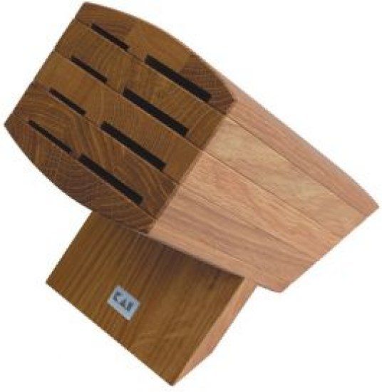 Dębowy blok mieszczący 8 noży. z łatwością można go rozłożyć w przypadku potrzeby wyczyszczenia otworów. Szerokie otwory w bloku przystosowane są specjalnie do noży japońskich i bez trudu zmieszczą szerokie ostrze noża Deba.