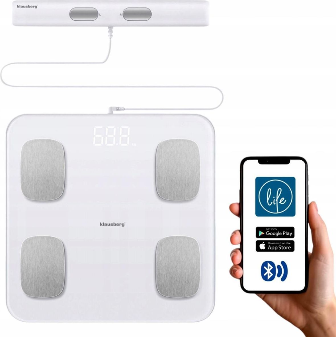 WAGA ŁAZIENKOWA ELEKTRONICZNA ANALITYCZNA BMI Z POMIAREM TŁUSZCZU BIAŁA Marka: KLAUSBERG Kod produktu: KB-7853 Waga łazienkowa KLAUSBERG KB-7853 to zaawansowane urządzenie, które umożliwia kompleksowy pomiar składu ciała w warunkach domowych. Dzięki precyzyjnej technologii oraz nowoczesnemu designowi w białym kolorze, waga ta spełni oczekiwania nawet najbardziej wymagających użytkowników. Idealna dla osób dbających o zdrowie, monitorujących postępy w treningu lub chcących lepiej zrozumieć swoje ciało. Kontroluj swoje wyniki i pomiary za pomocą aplikacji "MovingLife" dostępnej na Android oraz iOS. Inteligentna transmisja Bluetooth umożliwia synchronizację z aplikacją MovingLife na systemy Android i iOS, pozwalając na łatwe śledzenie wyników. Osiem elektrod zapewnia wysoką dokładność pomiarów dzięki jednoczesnemu wykorzystaniu czterech elektrod na stopy i czterech na dłonie. Urządzenie mierzy szeroki zakres parametrów, w tym wagę, wskaźnik BMI, zawartość tkanki tłuszczowej, poziom nawodnienia, masę mięśniową, masę kostną, białko, tłuszcz trzewny, tłuszcz podskórny oraz beztłuszczową masę ciała. Dodatkowo waga określa wiek metaboliczny, typ sylwetki (somatotyp), podstawowe (BMR) i aktywne zapotrzebowanie kaloryczne (AMR) oraz oferuje ogólną ocenę składu ciała. Maksymalna nośność wynosi 180 kg (400 funtów), z precyzyjnym podziałem na 100 g (0,2 funta), co gwarantuje dokładność pomiarów. Automatyczne włączanie i wyłączanie zwiększa wygodę użytkowania, a wbudowane wskaźniki ostrzegają o niskim poziomie baterii oraz błędach pomiarowych. Waga została wyposażona w czytelny wyświetlacz LED, który zapewnia wygodę odczytu wyników w każdych warunkach oświetleniowych. Zasilana czterema bateriami AAA (1,5 V), co czyni ją prostą w obsłudze i łatwą do utrzymania w gotowości. Dzięki segmentowej analizie składu ciała waga KLAUSBERG KB-7853 pozwala uzyskać szczegółowe dane dotyczące różnych części ciała, co czyni ją idealnym wyborem dla osób trenujących lub pragnących dokładnie monitorować zmiany w swojej sylwetce. Możliwość zapisywania i analizy danych w aplikacji daje użytkownikowi pełną kontrolę nad postępami. Waga łazienkowa KLAUSBERG KB-7853 to połączenie nowoczesnej technologii, funkcjonalności i eleganckiego wzornictwa. Jej zaawansowane funkcje pomiarowe czynią ją niezastąpionym narzędziem w codziennej trosce o zdrowie i kondycję. To idealne rozwiązanie dla każdego, kto chce precyzyjnie kontrolować swoje ciało i wprowadzać świadome zmiany w swoim stylu życia. Waga podaje pomiary takie jak Waga Indeks BMI Zawartość tłuszczu Nawodnienie Mięśnie szkieletowe Kości Białko Mięśnie Tłuszcz trzewny BMR / AMR Tłuszcz podskórny Ocena ogólna Wiek ciała Somatotyp Beztłuszczowa masa ciała