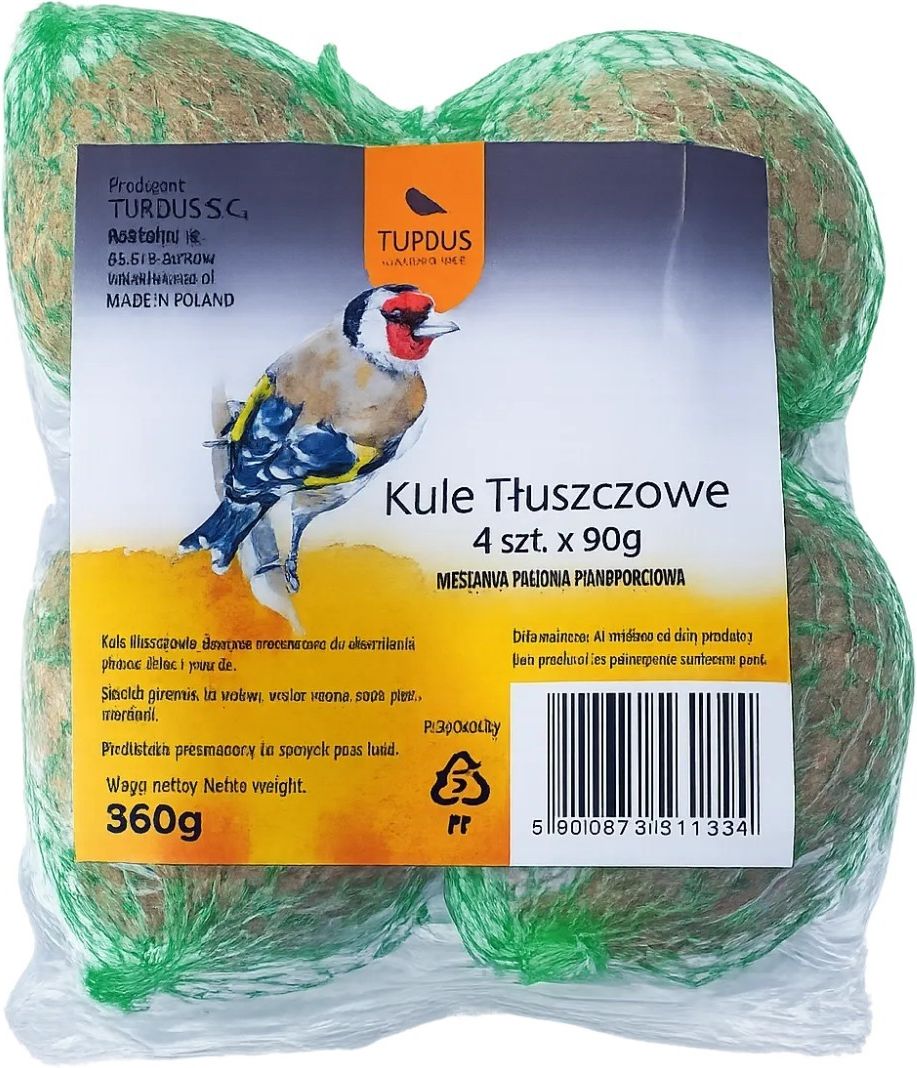 Kule tłuszczowe w siatce 4 szt. Wysokiej jakości kule tłuszczowe to idealny pokarm uzupełniający dla ptaków dziko żyjących w okresie jesienno-zimowym. Składają się z bogatej mieszanki zbóż (pszenica, sorgo, proso, słonecznik) oraz łoju wołowego, dostarczając niezbędnej energii i składników odżywczych w mroźne dni. Umieszczone w praktycznej siatce, są gotowe do bezpośredniego zawieszenia w ogrodzie, na balkonie lub w karmniku. Mieszanka: pszenica, łój wołowy, weglan wapnia, sorgo, proso, słonecznik Zastosowanie: kule tłuszczowo-zbozowe przeznaczone do dokarmiania ptaków dziko zyjacych.