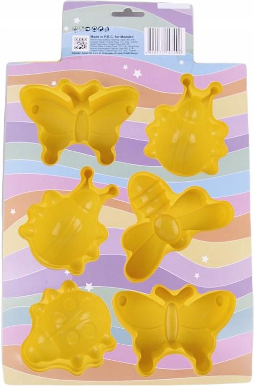 FORMA SILIKONOWA DO MUFFINEK BABECZEK CIASTEK MYDŁA ŚWIEC Forma silikonowa do pieczenia babeczek Maestro MR 1054 Forma silikonowa do pieczenia babeczek, można w nich przygotować również lody oraz inne ulkubione desery. Kstałt motyli oraz biedronek z pewnością zachęcą dzieci do wspólnego przygotowania smakołyków. Forma jest na 6 ciastek, jest głęboka oraz dobrze odwzorowuje kształty. Charakterystyka: Długość formy: 27,5 cm Szerokość: 21 cm Wysokość: 3 cm Przeznaczona Do Wielokrotnego Użytku, Nadaje Się Do Mycia w Zmywarce, Duża Elastyczność Formy Ułatwia Wyjęcie Gotowego Mydełka, babeczki, świecy Materiał Odporny Na Temperatury Pomiędzy -40'C a +230'C, Bezpieczna Dla Dzieci oraz Przyjazna Środowisku. Zastosowanie: Idealna Do Samodzielnego Wykonywania Mydełek, Wykonywanie Ciasteczek, Czekolad, Puddingów, Lodu czy Masy Solnej.